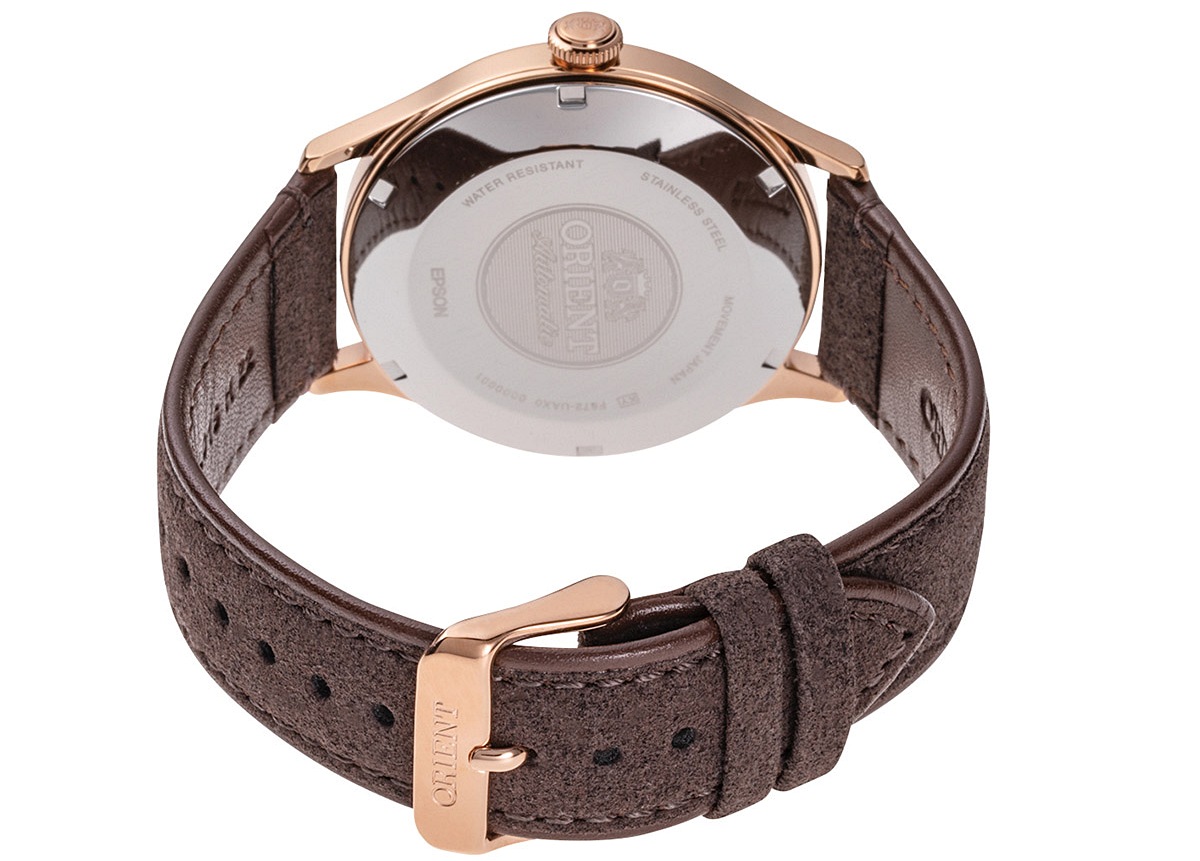 Podobnie jak większość konkurentów, Orient wprowadza na rynek tarcze w kolorze błękitnym (nr ref. RA-AC0P03L) i zielonym (RA-AC0P01E). Oprócz tego, proponuje oliwkowy brąz (RA-AC0P04Y) i ciemnogranatowy cyferblat ze wskazówkami i indeksami w kolorze różowego złota (RA-AC0P02L).