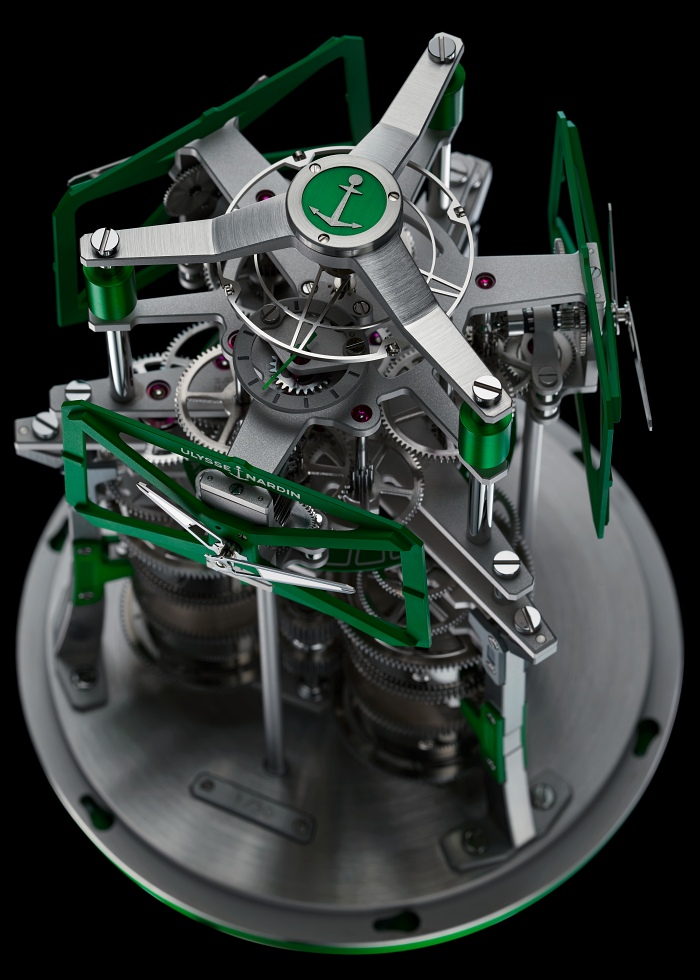 Zegar mechaniczny, pokaz możliwości Ulysse Nardin, składający się z 675 elementów może pochwalić się długą, wynoszącą 12 pełnych miesięcy rezerwą chodu. Lecz do zaprezentowania szczegółów pracującego mechanizmu przejdziemy nieco później.