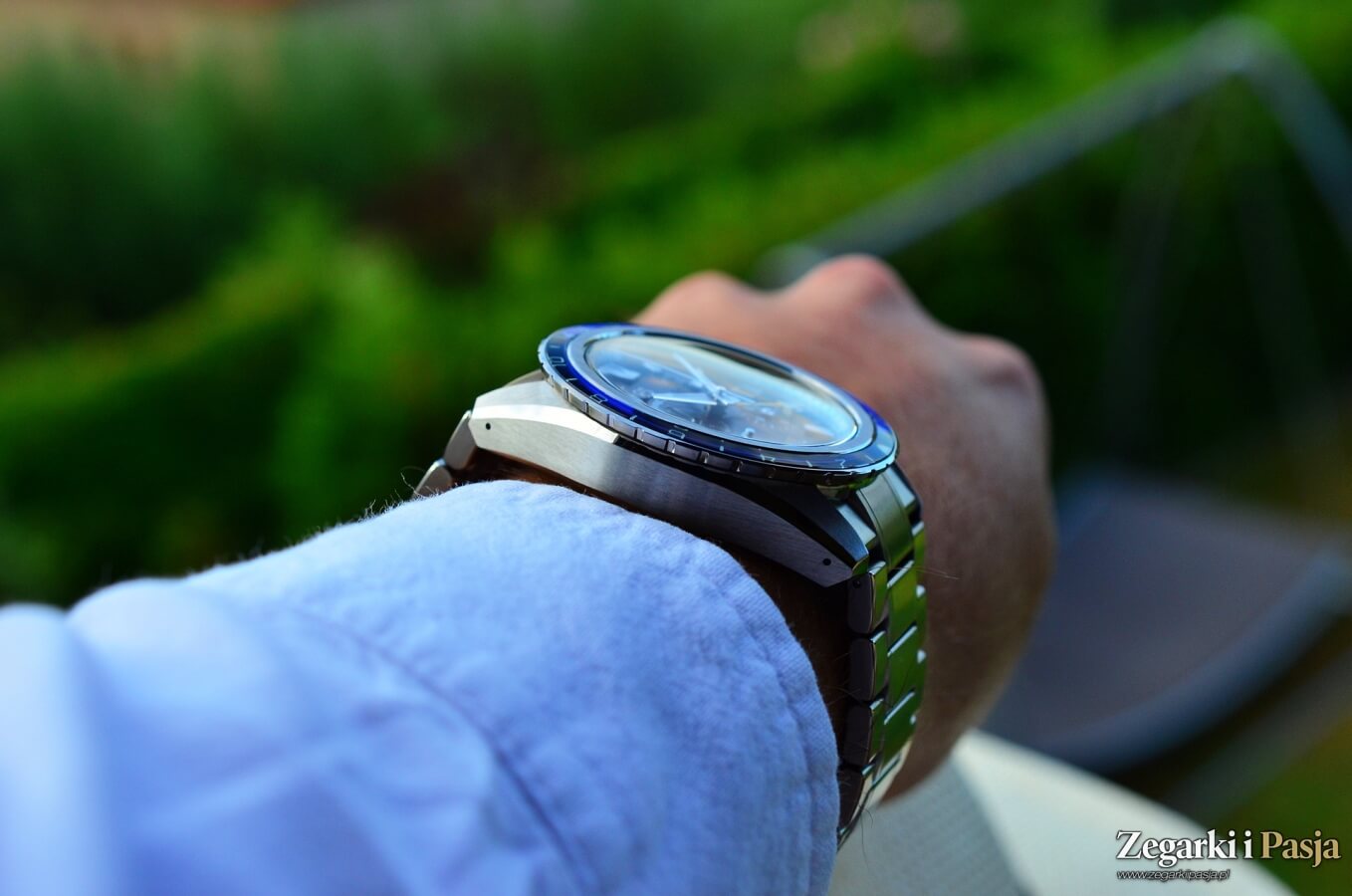 Kiedy zaś jest oświetlona, szczególnie światłem naturalnym, bywa wręcz jasnobłękitna. Od szkła oddzielona jest dodatkowym pierścieniem o szczotkowanej powierzchni z fazowanymi i polerowanymi krawędziami. Zewnętrzna krawędź lunety ma delikatne nacięcia. To ułatwia jej chwyt palcami, a sama luneta pracuje z delikatnym, przyjemnym oporem. Luneta okala podwójnie zakrzywione szkło szafirowe z naniesioną powłoką antyrefleksyjną, nakładaną od wewnątrz. Zegarek gwarantuje klasę wodoszczelności do 100 m.