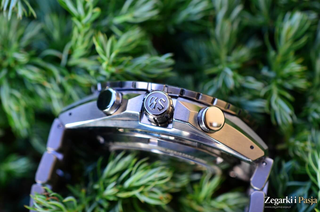 Od razu rzuca się w oczy nietypowy układ małych subtarcz. Najczęściej spotykane w zegarkach ze stoperem warianty układu to tzw. Bi-compax, czyli tarcze na godzinach: 3. i 9., często z dodatkową na godzinie 6. W zegarkach kwarcowych popularne jest ułożenie totalizatorów na godzinach: 6., 10. i 2. W recenzowanym Grand Seiko subtarcze są na godzinach: 9., 2. i 4.