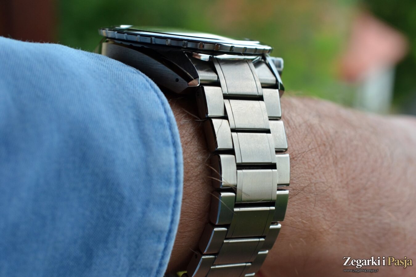 Spora jest też grubość, bo wynosi 15,8 mm. Jednak w połączniu ze średnicą to w sumie całkiem proporcjonalny, harmonijny wygląd został osiągnięty. Ważnym wymiarem jest tak zwana wysokość od ucha do ucha. Wynosi ona 52,6 mm. To także nie mało, ale warto zaznaczyć, że wiele zegarków o tak dużej kopercie ma ten wymiar większy, przez co trudniej zegarek dopasować. Tu nie jest źle. Ostatnia sprawa związana z wymiarami, to rozstaw uszu: 23 mm. Daje to szerokość dobrze współgrającą z całością, ale – niestety - nieco niestandardową.