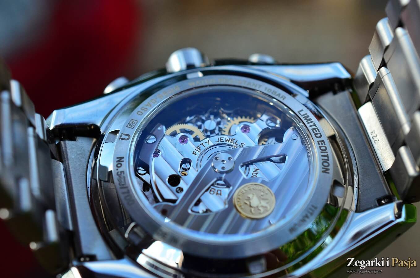 Płaska powierzchnia wokół przeszklenia jest kołowo szczotkowana. I to na niej wygrawerowano podstawowe informacje o tym modelu, w tym numer w limitowanej serii do 700 egzemplarzy.