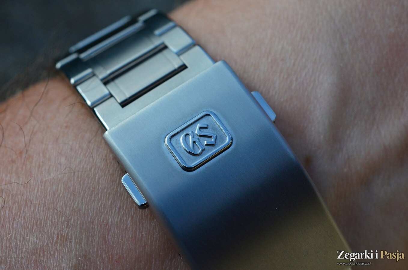 Zegarek oferowany jest na bransolecie, jak wcześniej wspominałem - wykonanej z tego samego materiału co koperta. To klasyczna konstrukcja trójrzędowa, choć można i określić ją jako 5-rzędową, bo środkowe ogniwa mają po obu stronach jakby dostawki, będące osobnymi elementami. Zapięcie to klamra składana, która jest zwalniana dwoma przyciskami. Na zewnętrznej części zapięcia umieszczono wstawiany element z logo marki.