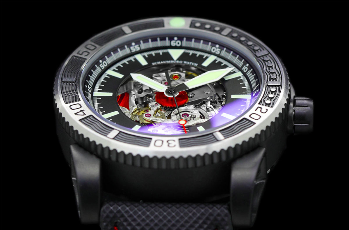 Trzy centralnie umieszczone wskazówki również zostały pokryte substancją świecącą, a końcówka wskazówki sekundowej odcina się czerwonym kolorem. Zabezpieczające tarczę szkło szafirowe ma powłokę antyrefleksyjną. Luneta zegarka pokryta jest stylizowanymi falami morskimi. Skupiając się na najbardziej widocznym elemencie, czyli mechanizmie - to zmodyfikowana wewnątrz firmy Schaumburg Sellita SW20A z automatycznym naciągiem sprężyny i czerwonym wahnikiem. Znajduje się on wewnątrz wykonanej ze stali (opcjonalnie z powłoką PVD) koperty o średnicy 45 mm. Zegarek ma imponującą klasę wodoszczelności aż do 500 metrów. W zestawie znajdziemy wodoodporny pasek skórzany.