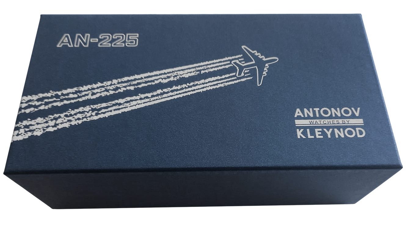 Biała giloszowana tarcza zawiera w sobie obrys Antonova, od dziobu z pasem w barwach Ukrainy. Ciekawie rozwiązano umiejscowienie daty: jest ona wkomponowana w okna kokpitu. Podłużne, stalowe indeksy godzinowe mają kształt sztabek, a na godzinach: 12., 3., 6. i 9. są one dodatkowo barwione na niebiesko. Wskazówki minutowa i godzinowa pokryto substancją świecącą, dla kontrastu wskazówka sekundowa została pomalowana na niebiesko.