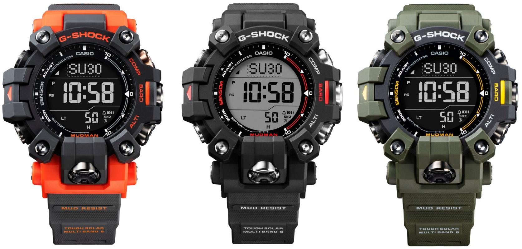 Nowy G-SHOCK Mudman GW-9500 dostępny jest w trzech wersjach kolorystycznych: czarnej o referencji GW-9500-1ER, ciemnozielonej z negatywowym wyświetlaczem - GW-9500-3ER oraz pomarańczowo-grafitowej również z odwróconą kolorystyką wyświetlacza - GW-9500-1A4ER.