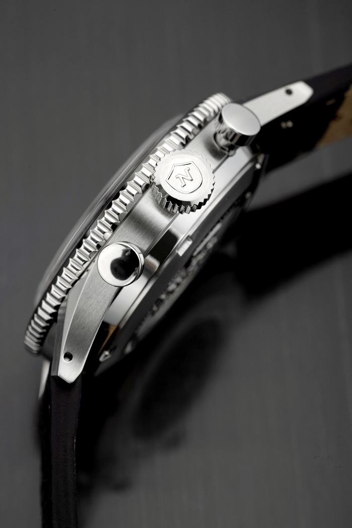 Górna część uszu, płaska, jest szczotkowana, tak jak boki koperty. Fazowania pomiędzy nimi wypolerowano na wysoki połysk. Uszy są wiercone na wylot, a tak zwane „centrum sterowania”, czyli koronka i pushery na prawym boku obudowy, wpisuje się w stylistykę tego zegarka, szczególnie z racji grzybkowatych przycisków. Dekiel jest pełny, zakręcany.