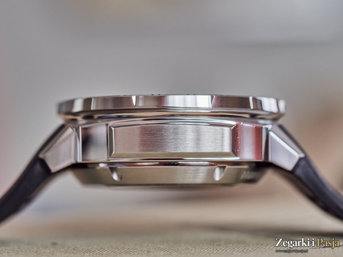 Wracając do obudowy - poziome powierzchnie koperty są satynowane, zaś boczne polerowane, co dodatkowo podkreśla „kanciastość” i surowość tej konstrukcji. Ten wygląd przypomina nieco Luminory Panerai’a, więc jest to zdecydowanie pozytywne skojarzenie.