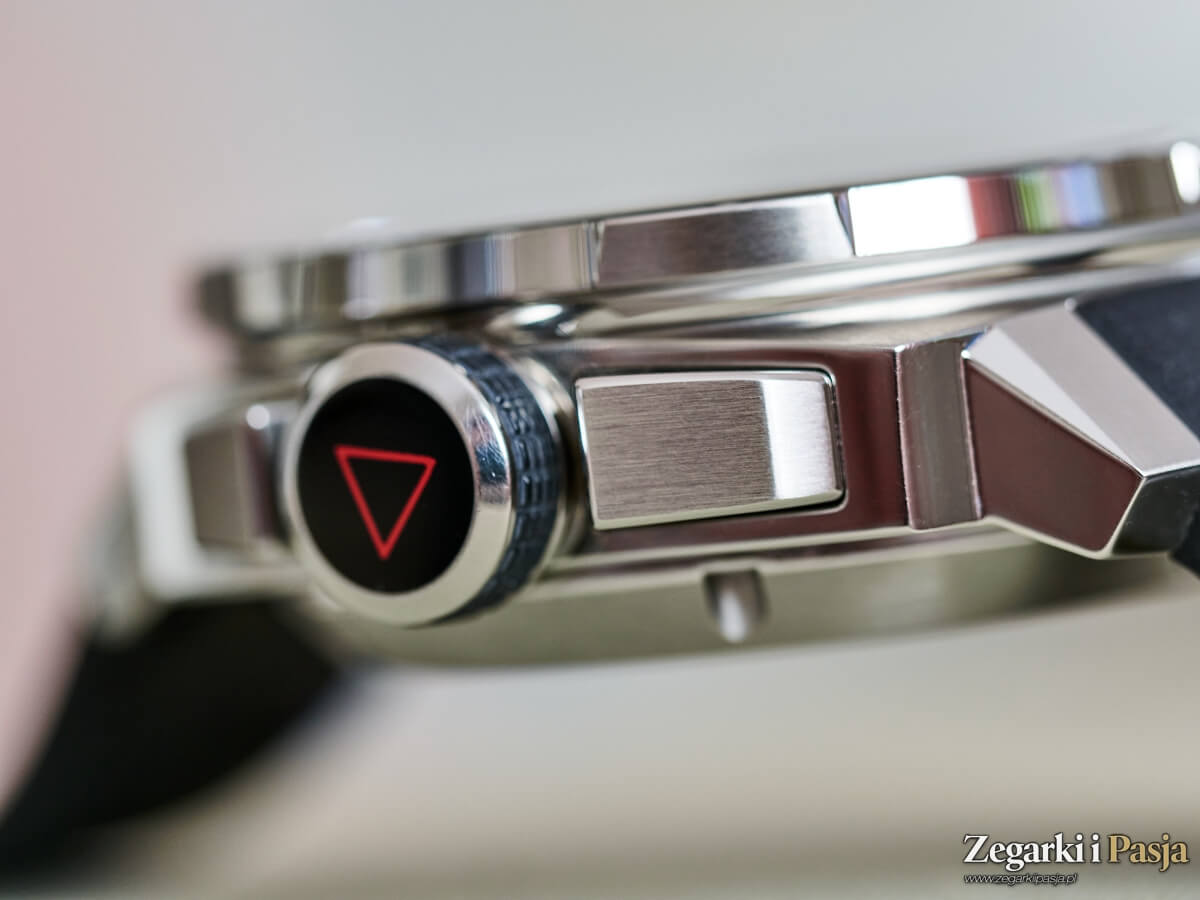Duża, zakręcana koronka z gumowaną nakładką została wkomponowana między dwa płaskie przyciski obsługi chronografu. Tutaj producent dobrze wykonał swoje zadanie, ponieważ na jachcie łatwo o zaczepienie zegarkiem np. o linkę, a każdy wystający element zwiększa ryzyko takiego zdarzenia. Widać zatem, że jest to zegarek nie tylko do lansu na pokładzie, ale do realnego wykorzystania w yachtingu.