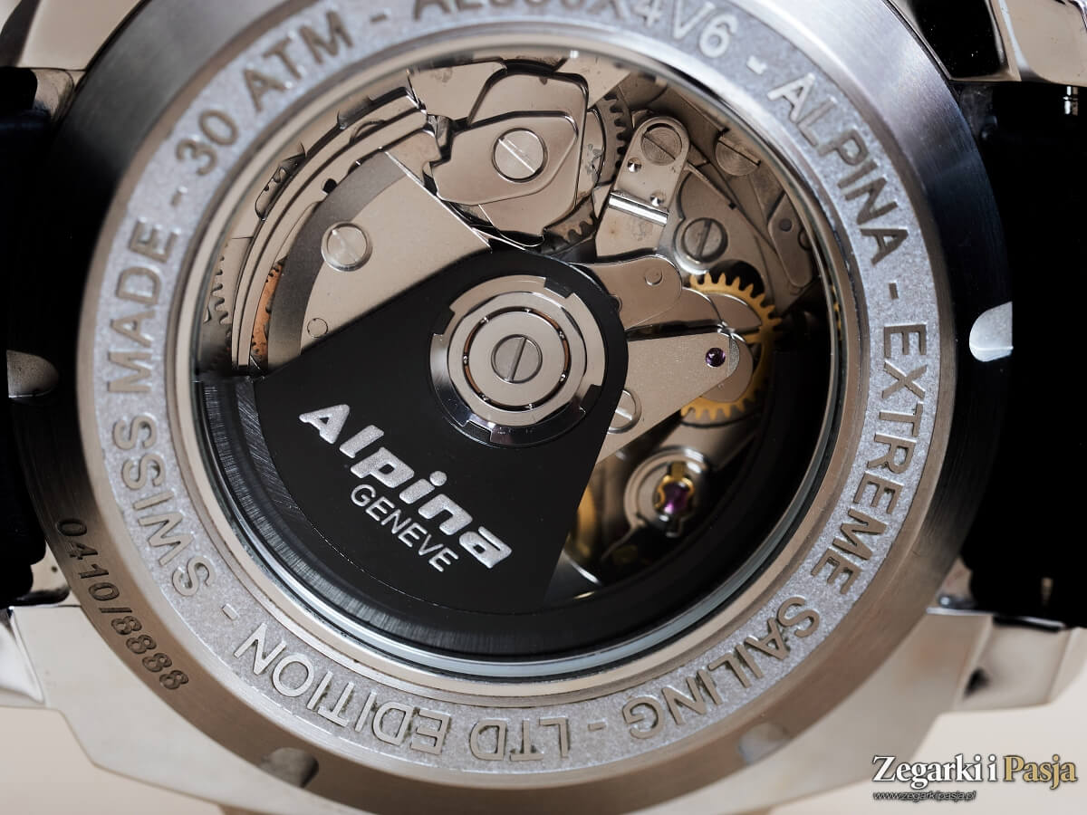 Mechanizm zegarka Alpina Extreme 40 Sailing Chronograph to kaliber Alpina AL-880 bazujący na szwajcarskim Sellita SW-500, wyposażony w moduł yacht timera opracowany samodzielnie przez markę Alpina. Średnica mechanizmu to 13,25 linii paryskich (1 linia paryska to 2,26 mm), czyli 30 mm, grubość mechanizmu wynosi zaś 7,9 mm. Łożyskowany na 25 kamieniach mechanizm pracuje z częstotliwością 4Hz, a w pełni nakręcony zapewnia 46 godzin rezerwy chodu.
