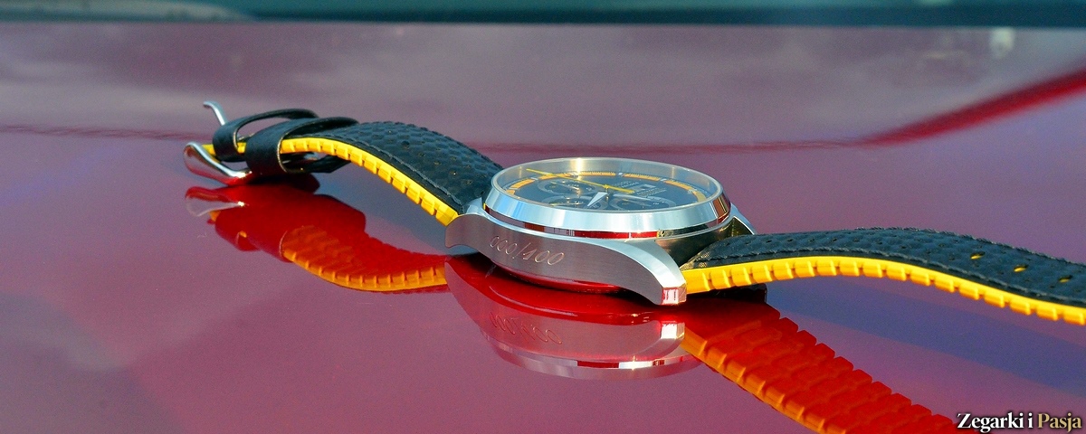 To lubiany przeze mnie rozstaw. Pozwala na zabawę paskami, modyfikowanie w ten sposób charakteru zegarka, a jako, że jest dość gruby to i paski możemy stosować także te bardziej „mięsiste”. Trzeba jednak przyznać, że te oferowane w komplecie są bardzo dobrej jakości i bardzo ciekawie rozwiązane. Jeden to pasek na bazie żółtej gumy, perforowanej i przez to dobrze wentylowanej od strony nadgarstka, a na powierzchni pokryty tworzywem o fakturze włókna węglowego. Drugi egzemplarz na takiej samej bazie od strony zewnętrznej ma pokrycie skórzane o fakturze skóry krokodyla. W tym pierwszym zapewne nie musimy obawiać się zamoczenia – co tez przy nadarzającej się okazji oczywiście zrobiłem.