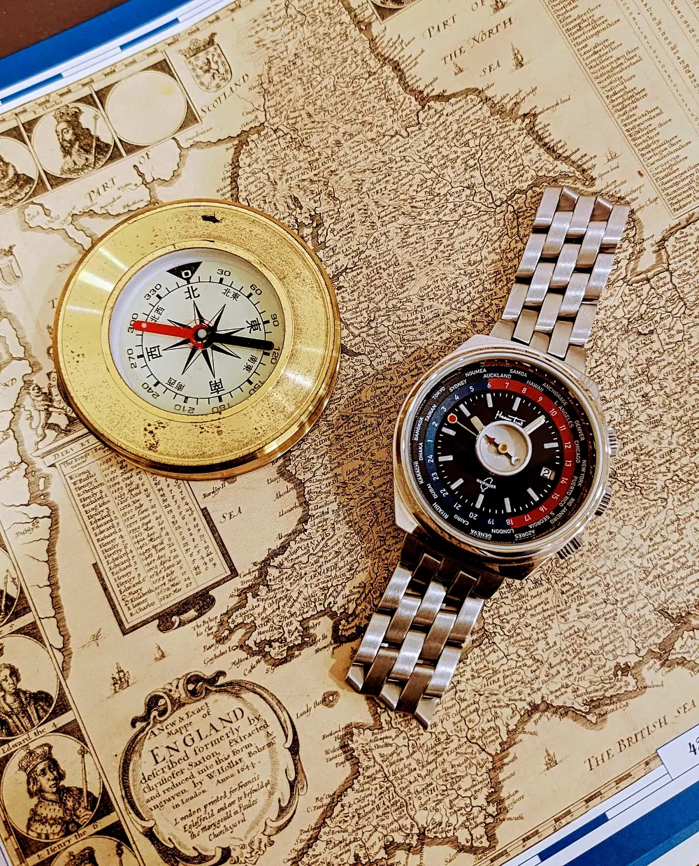 Do wyboru mamy wersje z kopertami o wielkości 40 mm lub 44 mm. A w efekcie pomysłu Erica powstał zegarek z kompasem pośrodku tarczy i z funkcją worldtimer. Wykorzystano mechanizm z automatycznym naciągiem sprężyny napędowej A. Schild AS2053. Zegarki wyglądają jakby były wyprodukowane 50 lat temu.