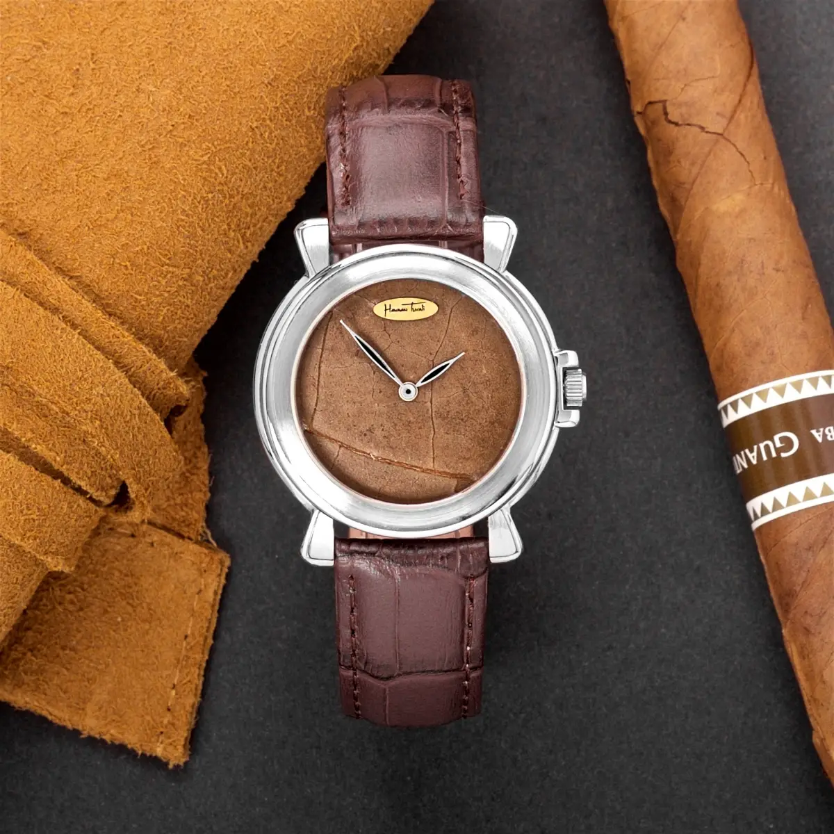 Niewielka koperta o średnicy 37 mm i 41 mm w wysokości od ucha do ucha doskonale oddaje klimat podkreślany kolorem tarczy. Sercem zegarka jest mechanizm A. Schild AS1537. Każde tarcza jest oczywiście inna, jak każdy liść tytoniu.