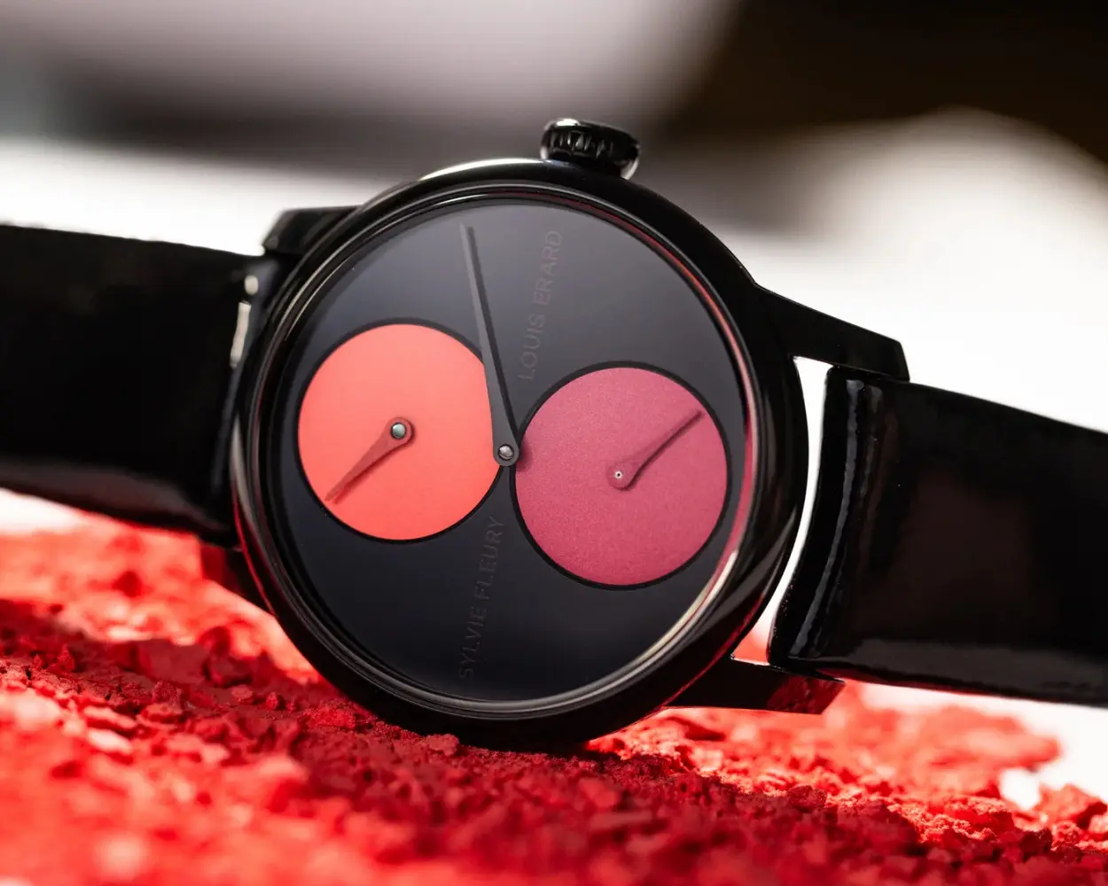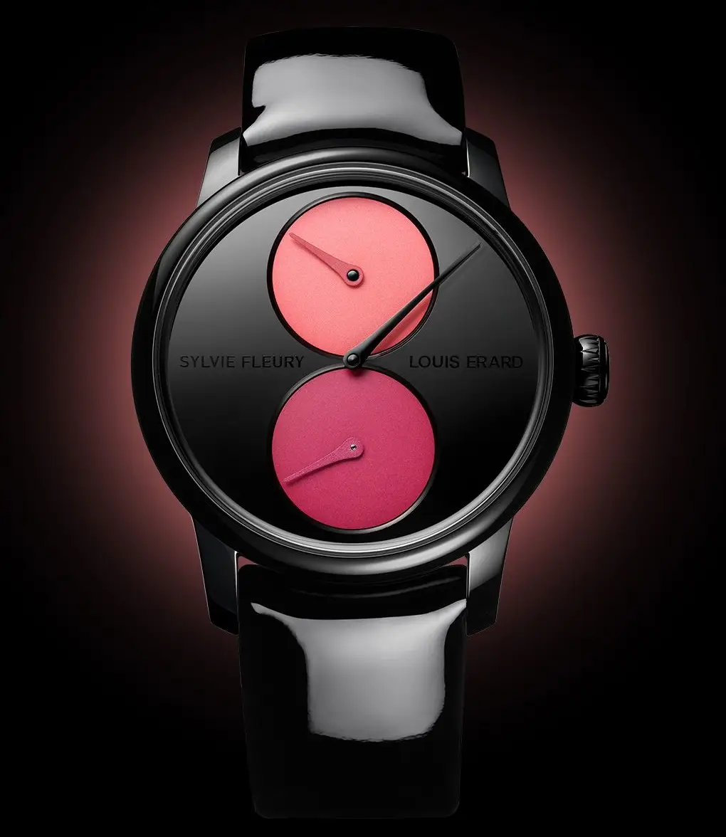 „Louis Erard ponownie (pierwsza współpraca miała miejsce w 2023 roku) łączy siły ze szwajcarską artystką Sylvie Fleury, tworząc wyjątkową edycję modelu Le Régulateur. Kultowy układ wskazówek „three in line” redefiniuje klasykę, a subtarcze inspirowane paletami do makijażu przełamują schematy designu.