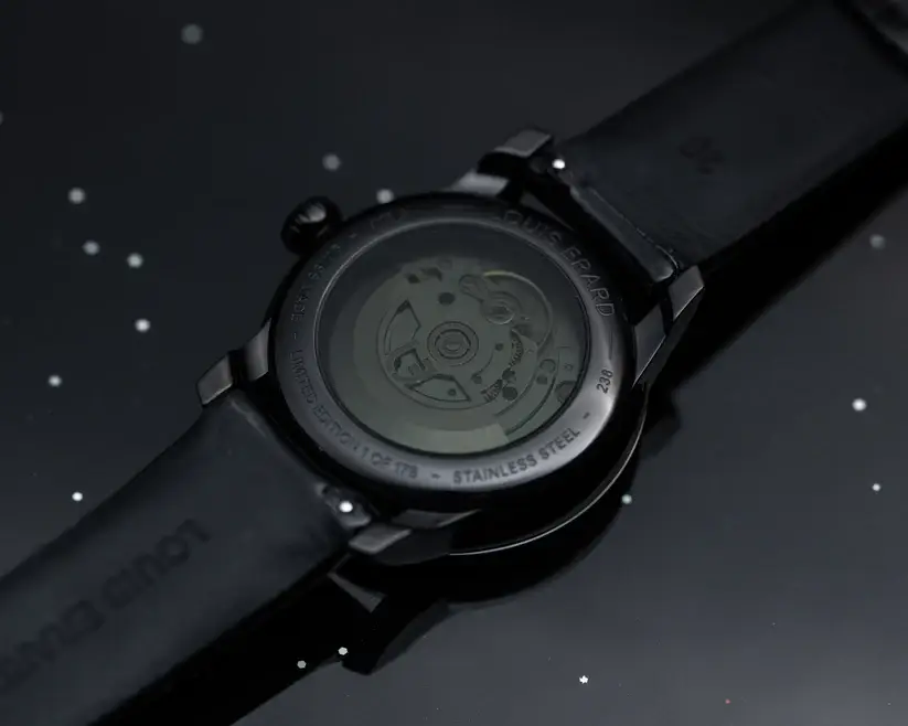 Koperta o średnicy 39 mm i grubości 12,25 mm wykonana jest ze stali szlachetnej i pokryta czarną powłoką PVD. Zegarek ma wypukłe szkło szafirowe z powłoką antyrefleksyjną po obu stronach. Dekiel jest więc transparentny, a dodatkowo przyciemniany - ukazuje on mechanizm, z grawerem „Limited Edition 1 of 178”.