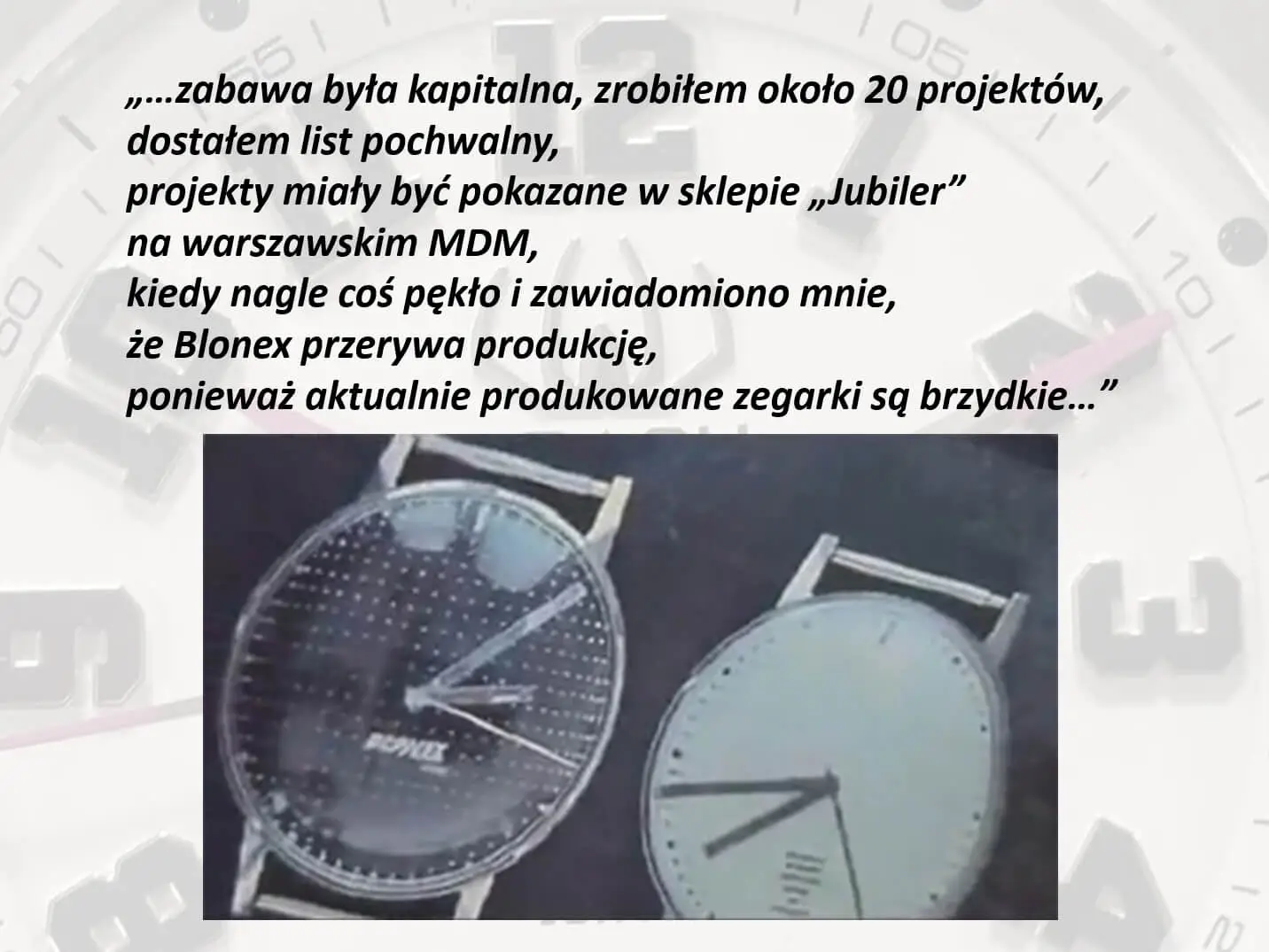 Na kolejnym slajdzie prelegent przedstawił dwa, z wielu wykonanych przez profesora Meisnera projektów zegarków, w ramach umowy z firmą Błonie, oraz słowa projektanta dotyczące prezentacji prac i… zakończenia zegarkowej produkcji.