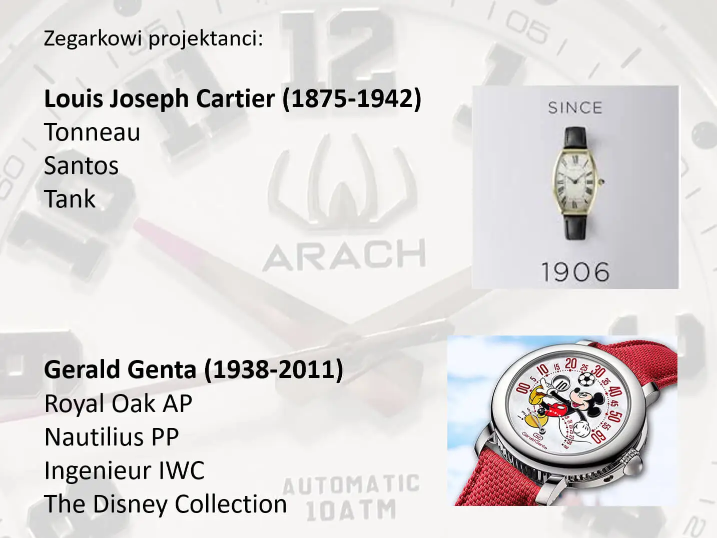Na slajdzie prelegent przedstawił doskonale rozpoznawalnych projektantów zegarków: Louisa Josepha Cartiera (1875-1942) i Geralda Gentę (1938-2011). Podając daty ich urodzin i śmierci prelegent zasugerował, że w przypadku Louisa Cartiera, o ile pierwsze projekty zegarków nieokrągłych, po czasie królowania zegarków kieszonkowych na pewno musiały być uznane za unikatowe, to mimo wszystko, zaprojektowanie zegarka z kopertą tonneau w roku 1906 należy uznać za coś niezwykłego.