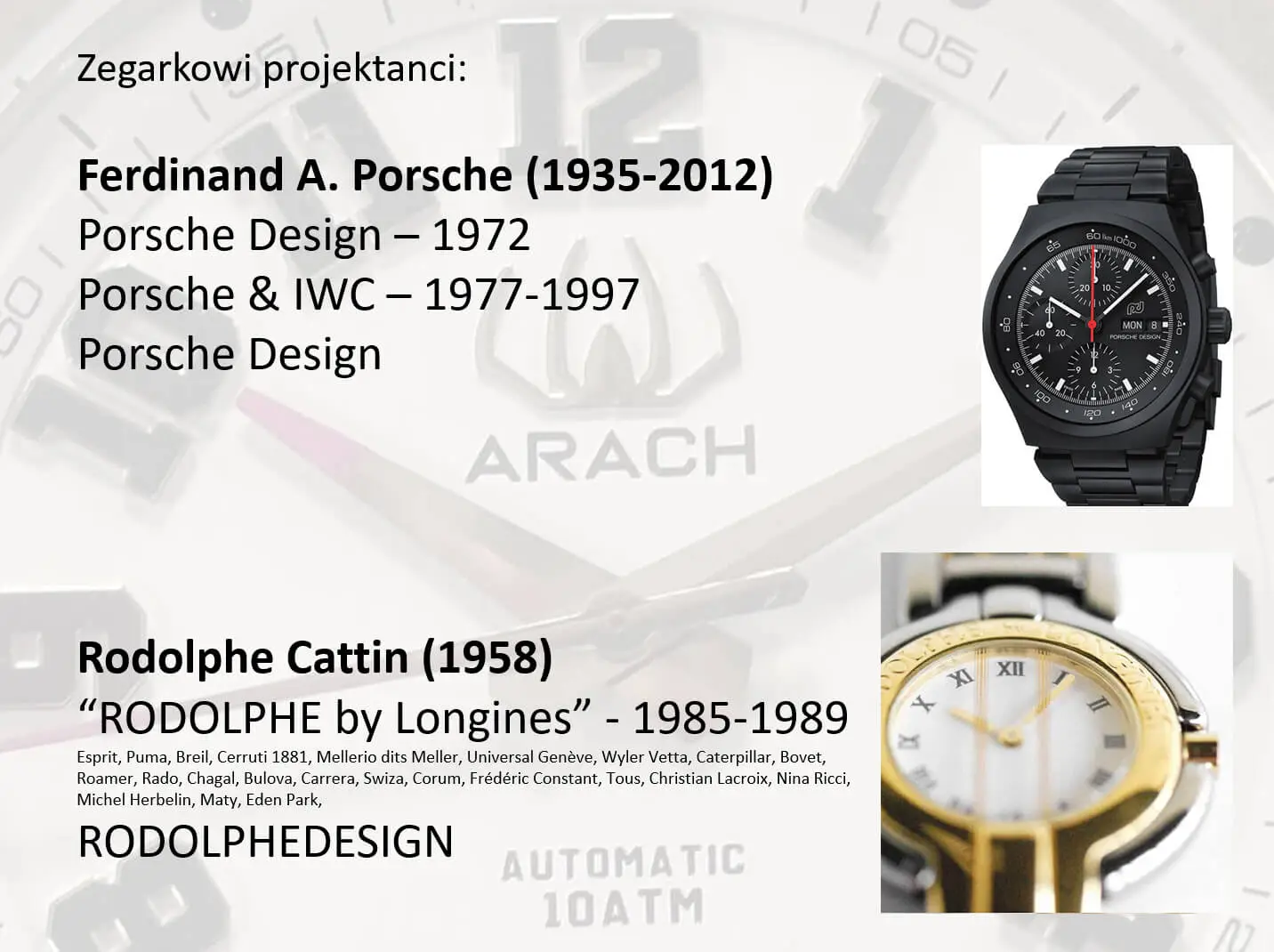 Na kolejnym slajdzie prelegent przedstawił dobrze znanego w kręgach zegarków i samochodów Ferdinanda Alexandra Porsche (1935-2012), który jest autorem projektów samochodów (Porsche 911 i Porsche 904), a w kręgach zegarkowych znany jest z projektowania zegarków. Pierwsze takowe zegarki były projektowane przez biuro Porsche Design (1973) z przeznaczeniem dla kierowców samochodów Porsche i dystrybuowane przez dilerów samochodów.