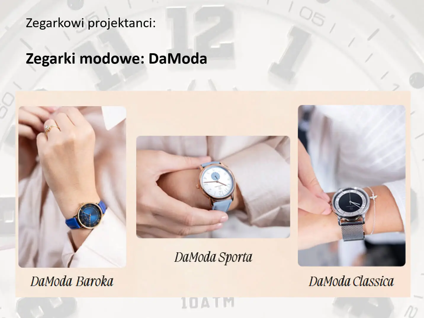 Wobec wielkiej liczby firm modowych oferujących zegarki, prelegent wybrał tylko jedną z nich, dla ilustracji omawianego tematu. Była nią polska marka DaModa.
