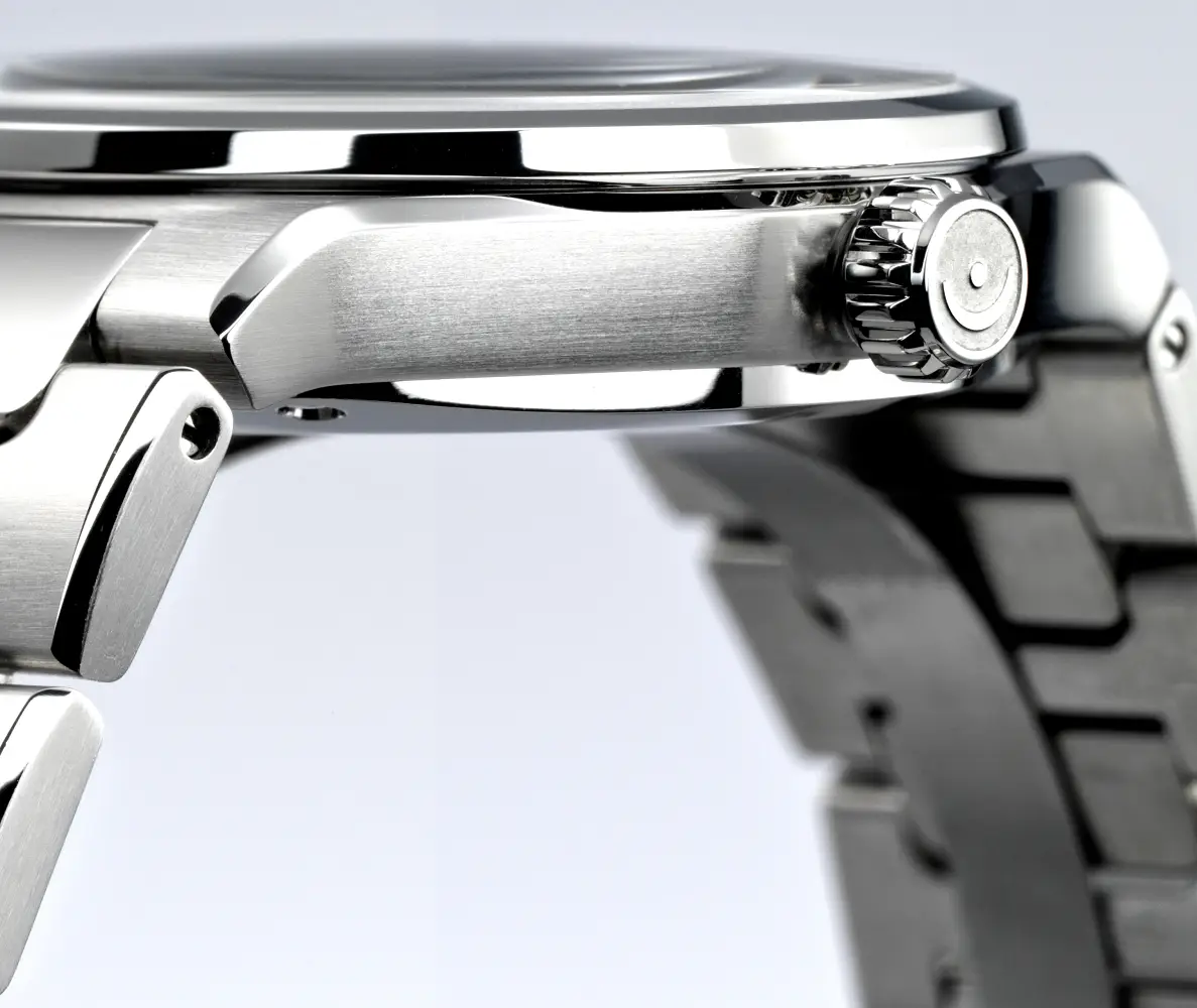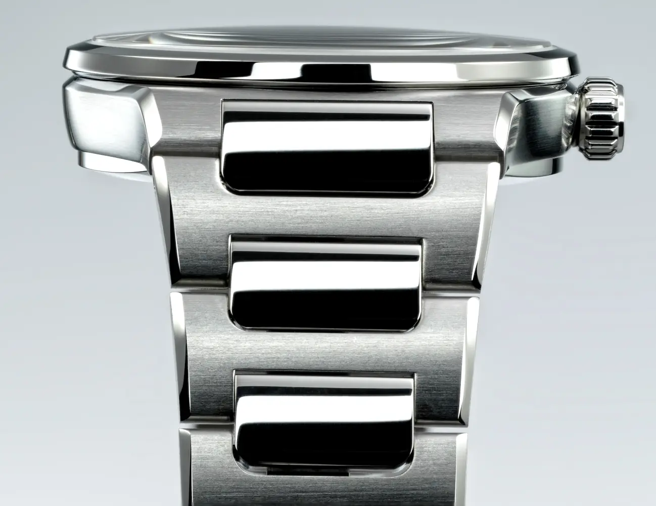 Teraz najważniejsza nowość – bransoleta. Ta została w pełni zintegrowana z kopertą, dzięki czemu zegarek prezentuje się jednolicie, ale przede wszystkim nowocześnie. Powierzchnie bransolety również łączą matowe i błyszczące elementy. Odnoszę wrażenie, że w ostatnim czasie zrobiła się swego rodzaju moda na zegarki ze zintegrowanymi bransoletami. I pewnie dlatego również firma MeisterSinger chciała mieć w swojej ofercie taki właśnie model.