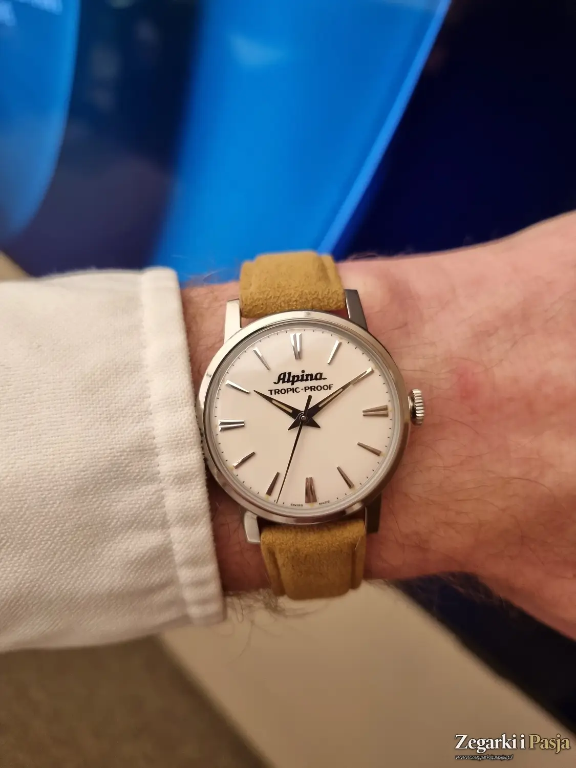 Jak widać, parafrazując klasyka - nie jest złoty, ale zdecydowanie skromny. I zrozumcie mnie dobrze - postrzegam to jako coś pozytywnego, bo choć obecnie głównie interesują mnie już zegarki wysublimowane, oferujące wysoki poziom zarówno w aspekcie wykonania, jak i kwestii technicznych, to będąc w miejscu, gdzie – dosłownie – na każdym kroku widać było jakieś „zegarkowe marzenie”, ta nowość Alpiny była w pewnym sensie odświeżająca, rzeczywista, bliska codzienności, w której żyjemy. Jeśli ktoś lubi klimat vintage, to z pewnością wpadnie mu ten model w oko, tym bardziej, że ma świetny pasek.