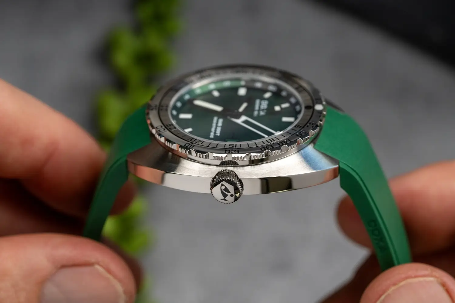 Nurkowy zegarek wodoszczelny do 250 m, z praktyczną funkcją dodatkową. Wszystko udało się zmieścić w bardzo modnej i komfortowej w użytkowaniu kopercie o żółwiowym kształcie, której średnica ma jedynie 40 mm, zapewniając idealną równowagę między możliwościami technicznymi, komfortem użytkowania i prezencją na nadgarstku.