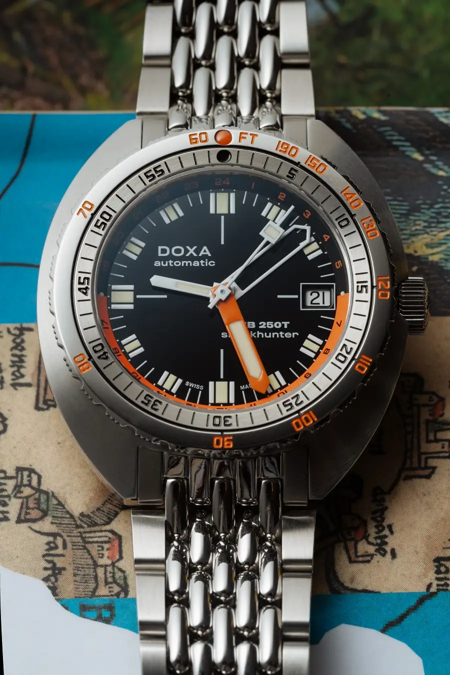 Uzupełniając kolekcję SUB 250T GMT, dostępny jest także zegarek w specjalnej edycji - Vintage Sharkhunter z gradientową tarczą (po raz pierwszy u Doxy), który oddaje hołd wcześniejszym modelom Sharkhunter z charakterystycznymi, całkowicie białymi wskazówkami.