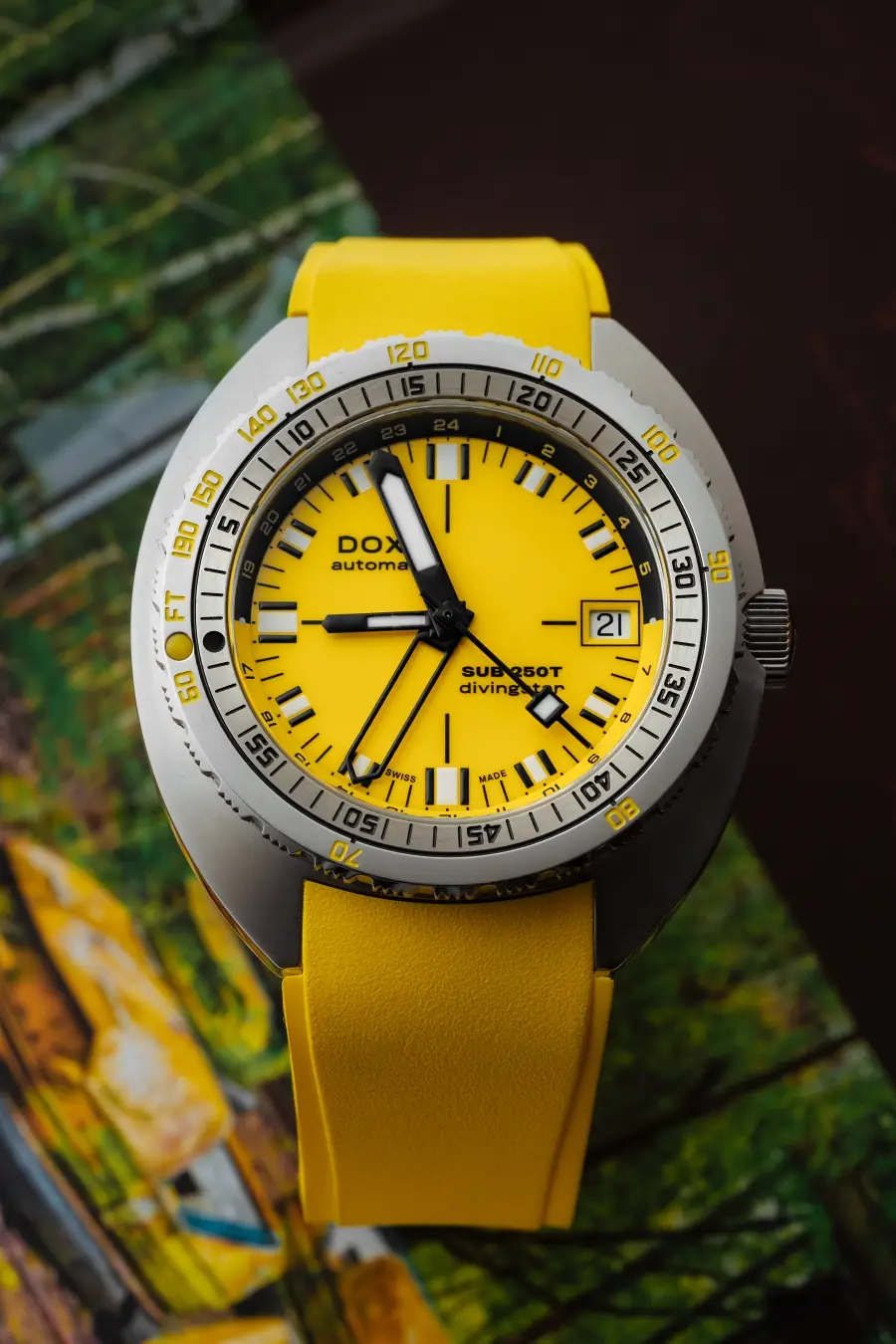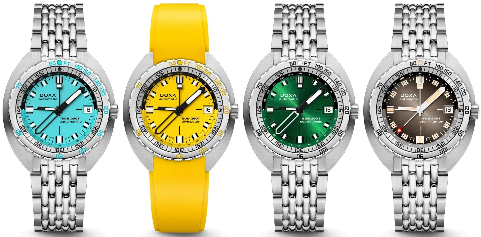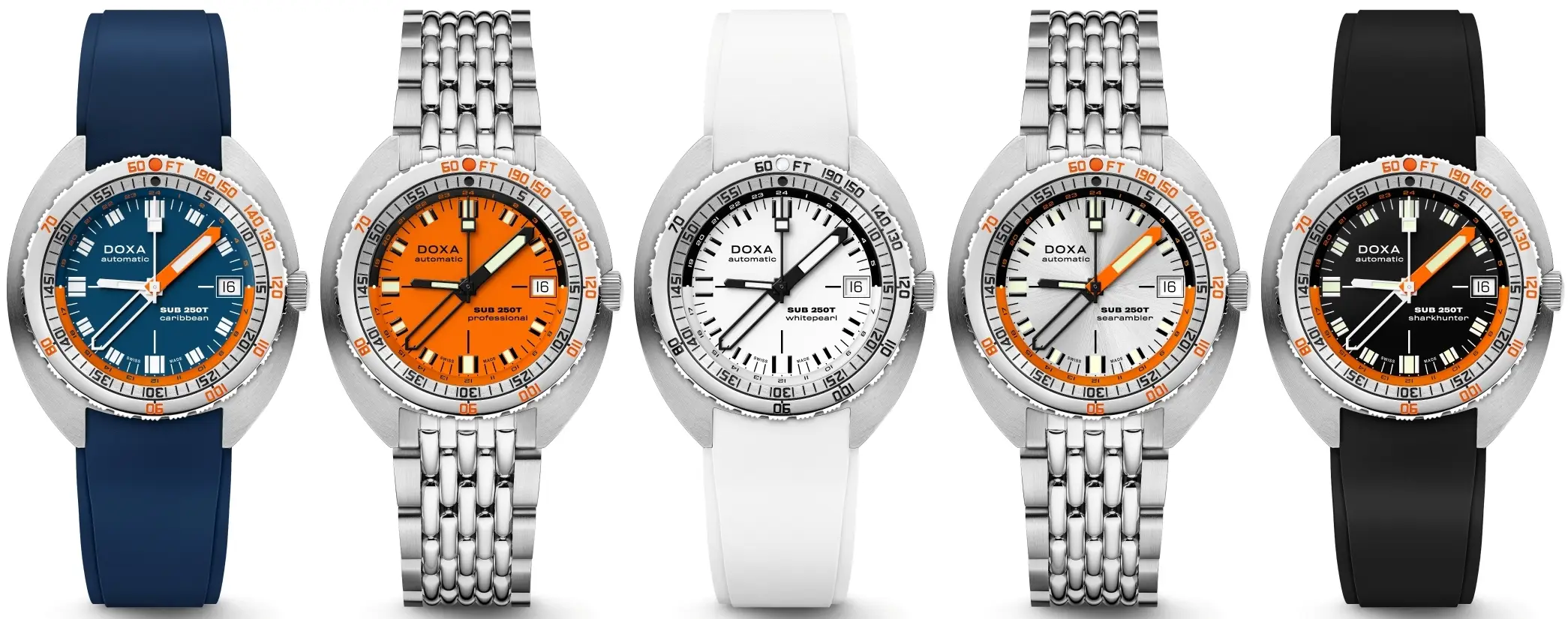 Marka Doxa w tej kolekcji zachowała charakterystyczną retro stylistykę, oryginalny układ lunety, świetne parametry techniczne, a także - w pełni w zgodzie z aktualną modą - bardzo szeroki wybór kolorystyczny, jeżeli chodzi o tarcze. Doxa SUB 250T GMT jest dostępna we wszystkich ośmiu charakterystycznych dla tej marki kolorach, z dopasowanym kolorystycznie paskiem wykonanym z gumy FKM, lub ze świetną bransoletą z ogniwkami kojarzącymi się z ziarenkami ryżu. Ten nowy model można uznać, że stylistycznie nawiązuje do ducha modeli Doxa SUB 750T GMT z 2006 roku, które cieszyły się ogromnym uznaniem w wariantach Professional, Sharkhunter, Caribbean i Divingstar.