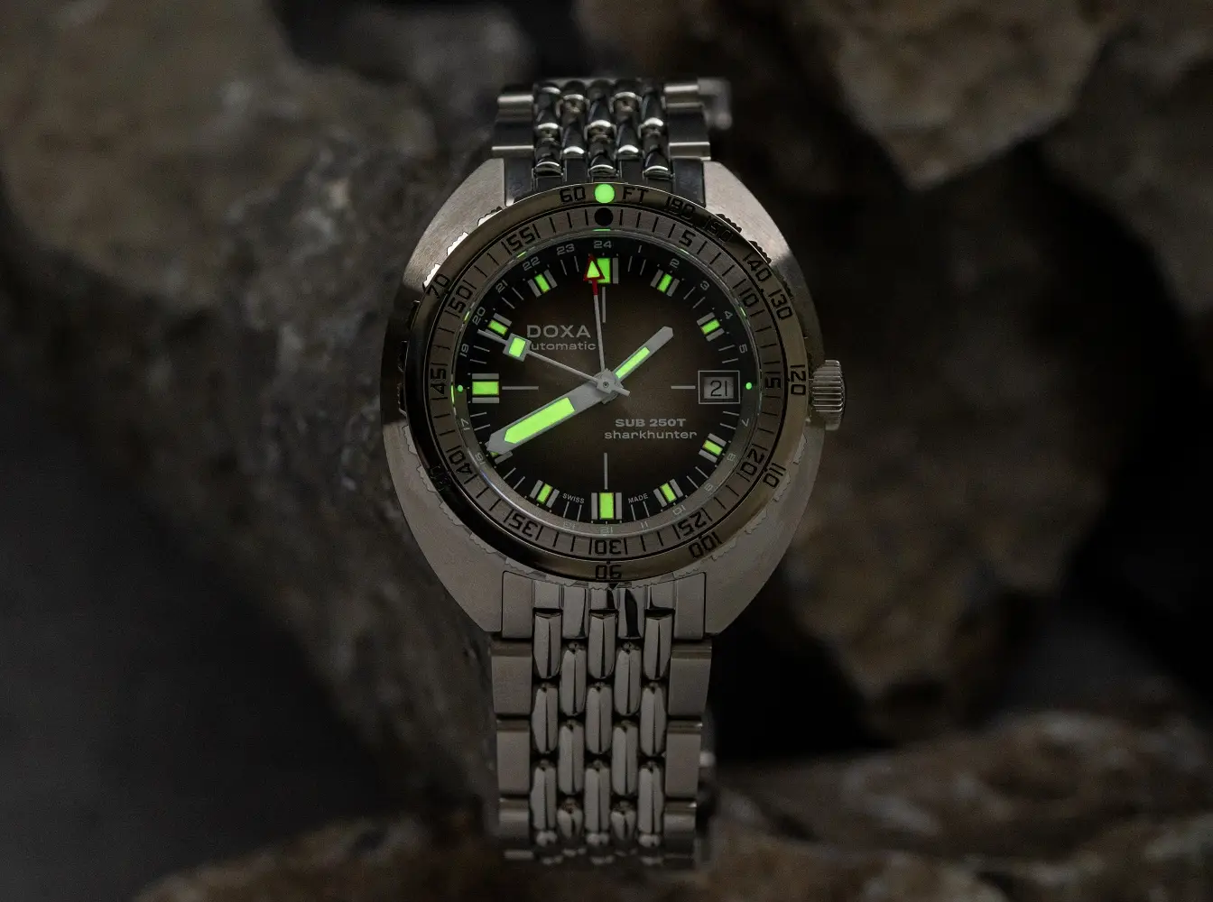 Do tych klasyków dołącza jeszcze specjalna edycja SUB 250T GMT Sharkhunter, osadzona w klimacie vintage, z gradientową tarczą – po raz pierwszy w kolekcji SUB. Hipnotyzujący hołd dla najwcześniejszych modeli Sharkhunter, z ich całkowicie białymi wskazówkami, subtelna estetyka retro przywołuje pionierską erę Doxa w profesjonalnym i rekreacyjnym nurkowaniu.