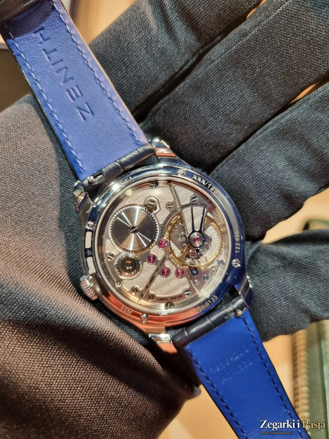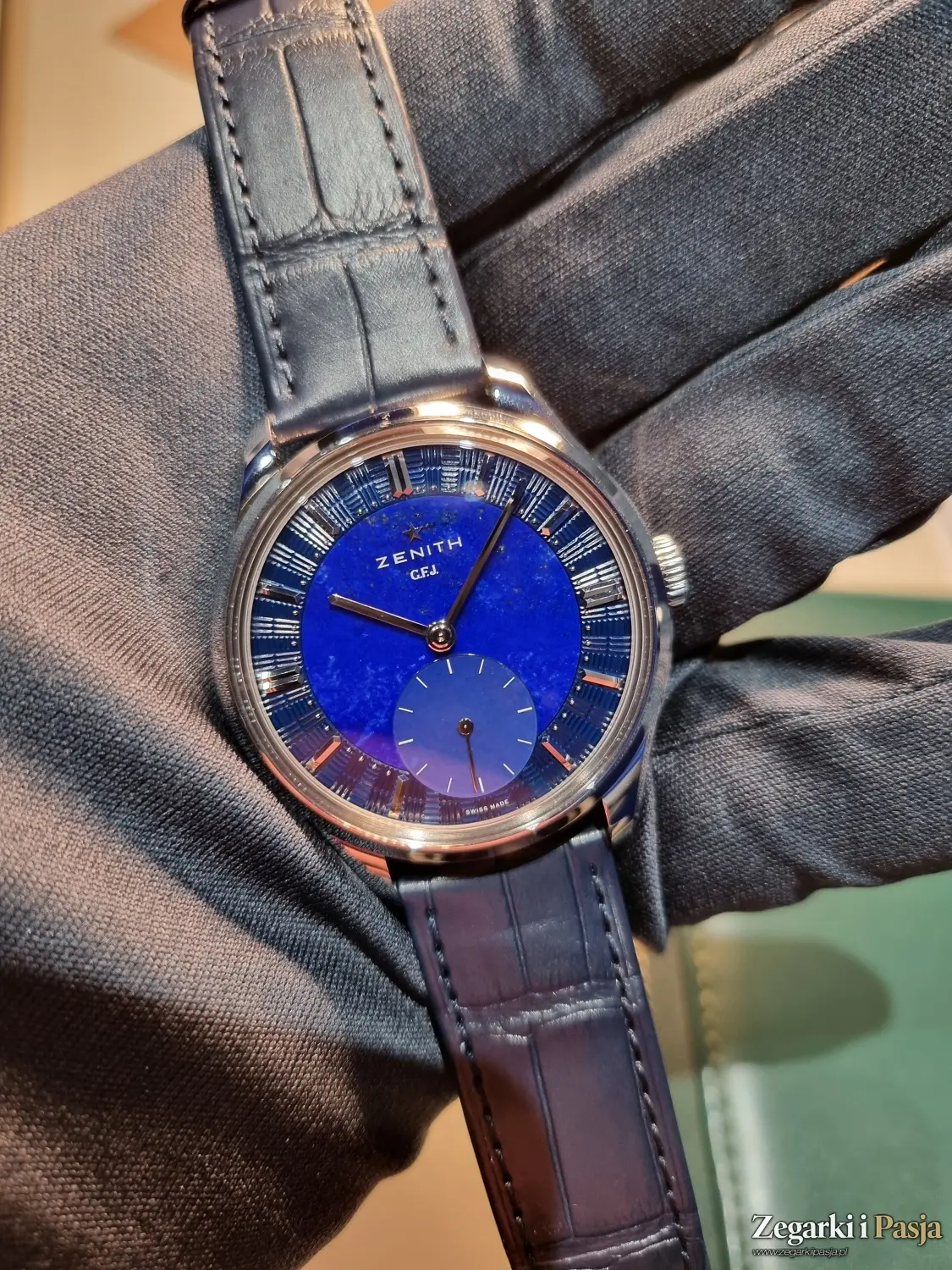 Niebieski kolor tarczy, wykonanej z lapis lazuli, oraz logo w kształcie gwiazdy podkreślają związek Zenith z niebem i kosmosem, a także dążenie do najwyższej precyzji – zenitu w zegarmistrzowskim rzemiośle. Estetyka lat 50, widoczna w proporcjach koperty i wzorze tarczy, oddaje ducha epoki, w której Calibre 135 święcił swoje największe triumfy.