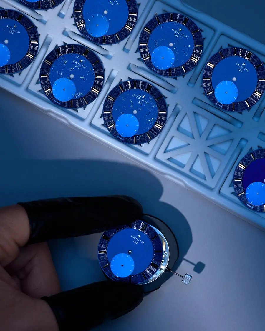 Centralna część tarczy wykonana jest z głęboko niebieskiego lapis lazuli, kamienia, który dzięki złotym drobinkom pirytu przypomina rozgwieżdżone niebo – idealne nawiązanie do nazwy i logo Zenith. Naturalna tekstura lapis lazuli sprawia, że każda tarcza jest unikatowa.