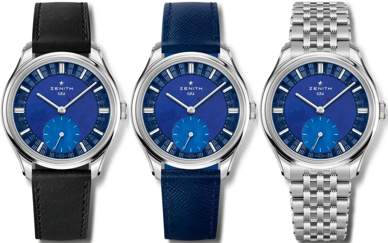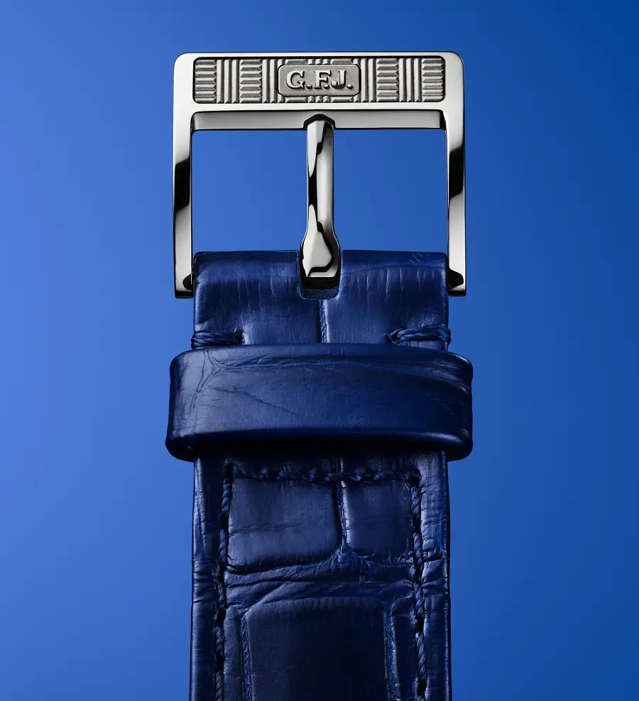 Zenith G.F.J. jest dostarczany z trzema paskami, co pozwala na dostosowanie zegarka do różnych stylizacji: granatowym ze skóry aligatora, który idealnie komponuje się z niebieską tarczą, czarnym z cielęcej skóry, oferujący bardziej klasyczny wygląd, oraz niebieskim z cielęcej skóry w wykończeniu "Saffiano", który dodaje zegarkowi nowoczesnego charakteru.