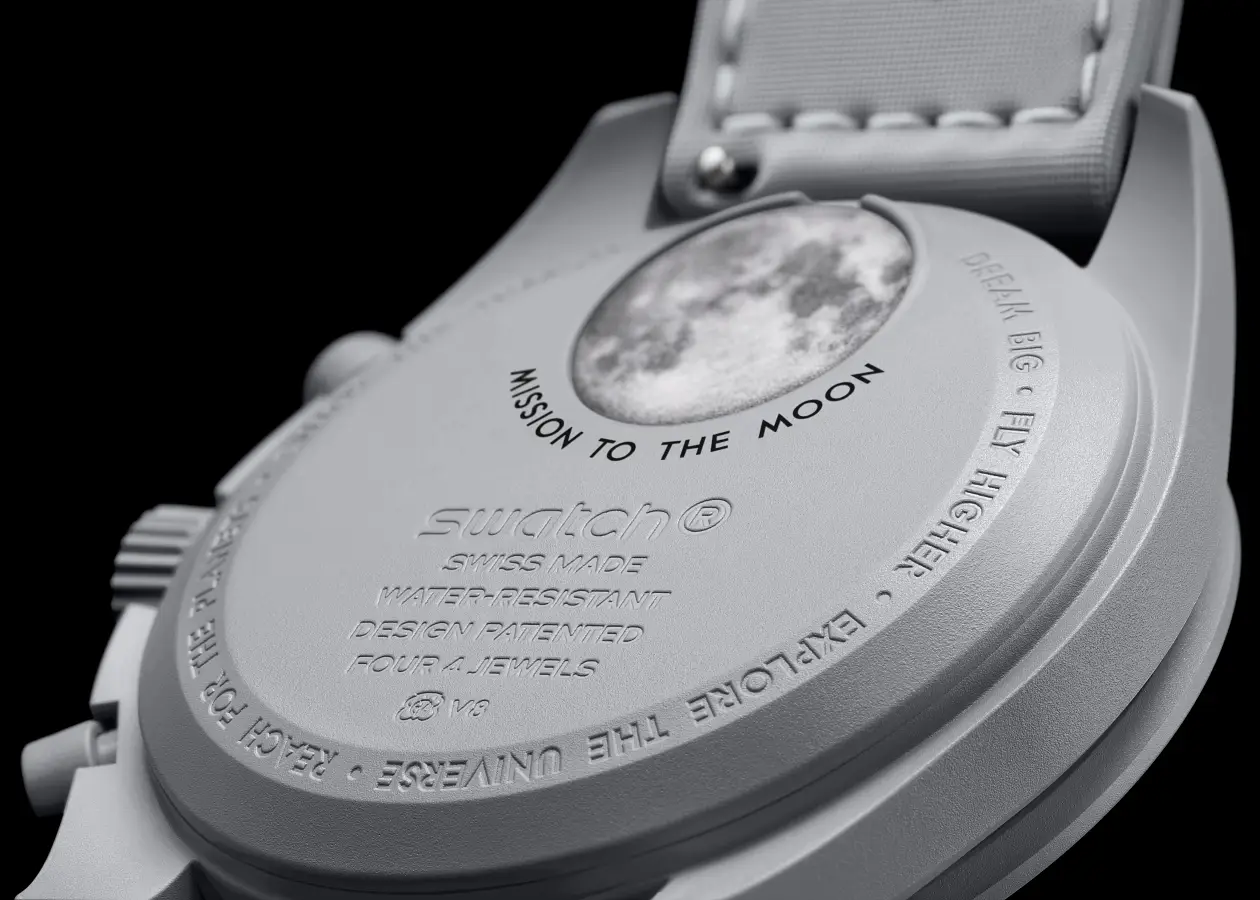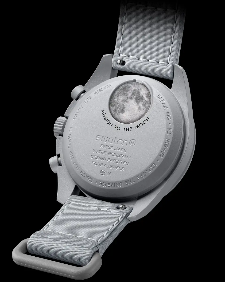 Zegarek Swatch MoonSwatch 1965 ma na deklu motto misji, natomiast na tarczy i koronce widoczne są logotypy OMEGA X SWATCH. Szary pasek z rzepem VELCRO®, odpowiedni do skafandra astronauty, dopełnia kosmicznego wizerunku, a jego kontrastowe przeszycie jest kolorystycznie dopasowane do koperty i paska. Oczywiście, z racji standardowego mocowania, możemy sobie dobrać dowolny pasek modyfikując charakter zegarka.