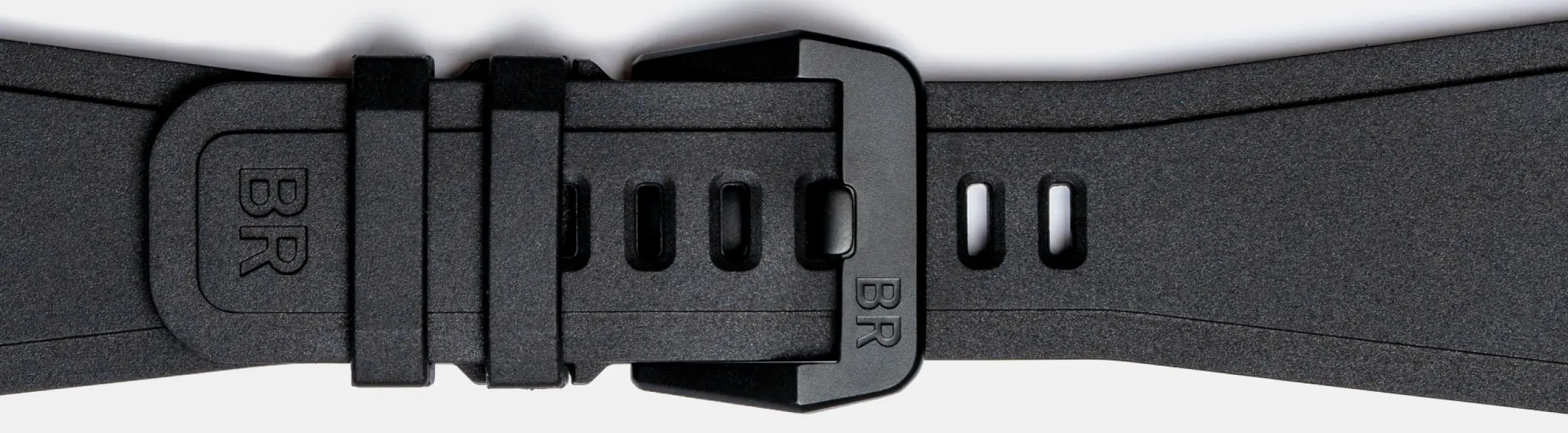 Zegarek otrzymujemy na gumowym pasku w kolorze czarnym, zapinanym na stalową klamrę dostosowaną do czarnej koperty, z odpowiednią powłoką PVD.