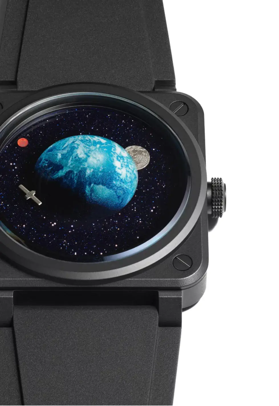Konceptualny, symboliczny w duchu zegarek Bell & Ross BR-03 Astro jest również wysoce „techniczny” w wykonaniu. Aby uzyskać realistyczne i wierne przedstawienie wizerunku Ziemi, zachowanie standardów precyzji i czytelności firmy Bell & Ross wymagało procesu nakładania kalkomanii pod szkłem.