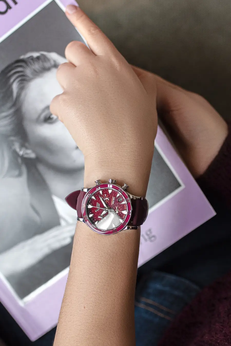 Pierwsze dwa nowe modele w tej kolekcji to zegarki ze stoperem, które mają japoński mechanizm kwarcowy TMI VK68. Jeden z chronografów ma tarczę w kolorze najbardziej zbliżonym do bordowego, oraz odpowiednio dopasowaną to niej wkładkę lunety. Sam kolor jest dość wyjątkowy i niespotykany, dodatkowo tarcza charakteryzuje się jeszcze inną cechą.
