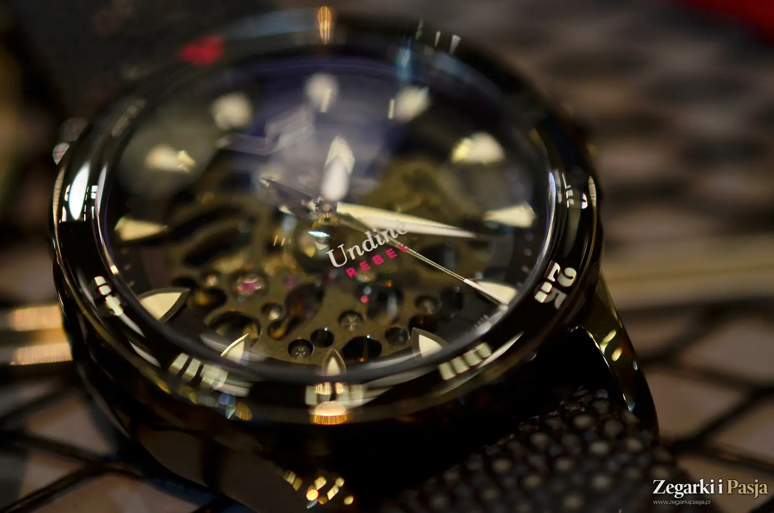 Zegarek Vostok Europe Undine Rebel – bo tak się nazywa, ma polerowaną kopertę, na którą nałożono ciemnoszarą powłokę PVD. Poza tym nie mamy tutaj klasycznej tarczy, ponieważ jest to zegarek typu skeleton, a więc tarcza jest ażurowana, a dodatkowo jej powierzchnia pokryta została rutenem.