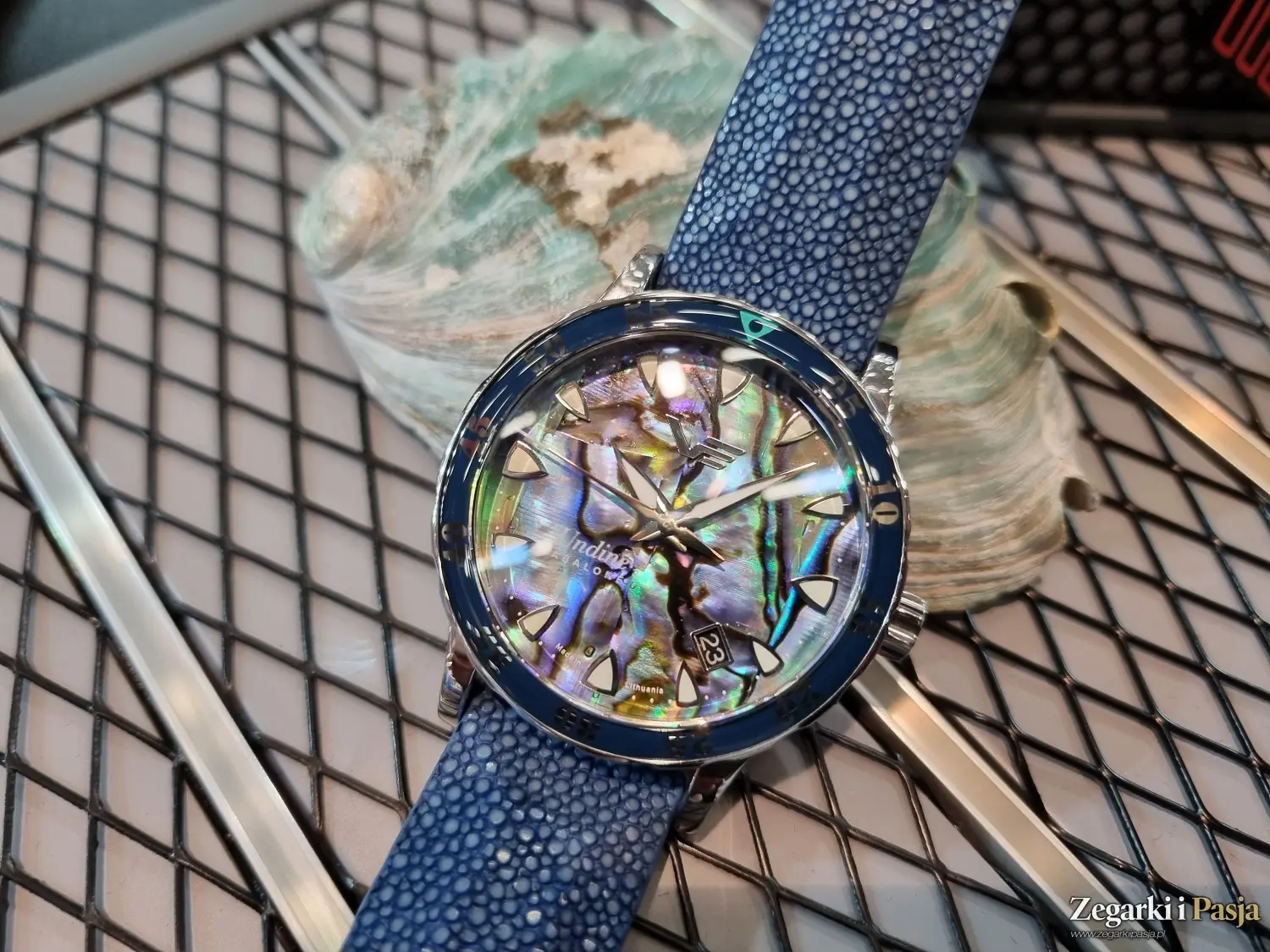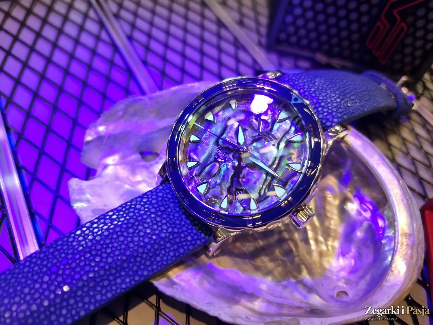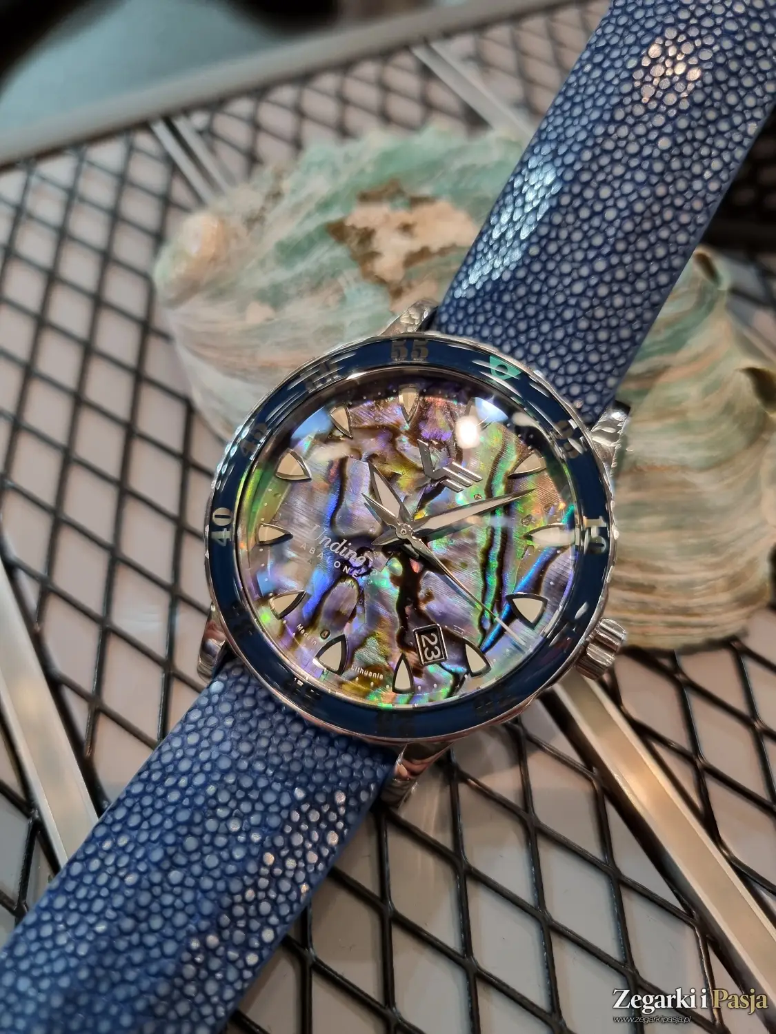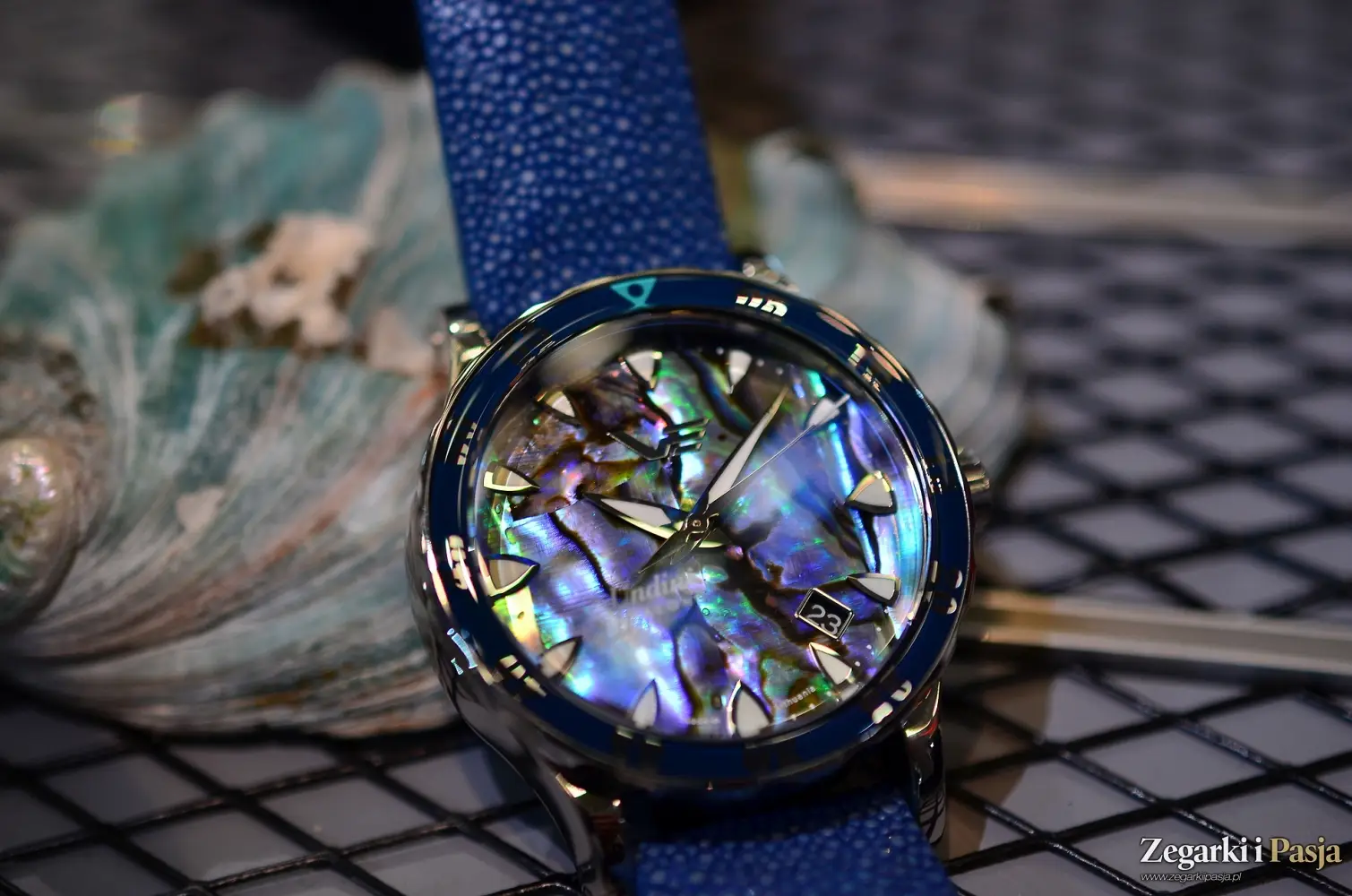 Ostatnia nowość w ramach zegarków mechanicznych z kolekcji Undine to model, który urzekł nas najbardziej. Teoretycznie nie ma w nim nic wyjątkowego, bo cechą taką najbardziej rzucającą się w oczy jest tarcza wykonana z masy perłowej.