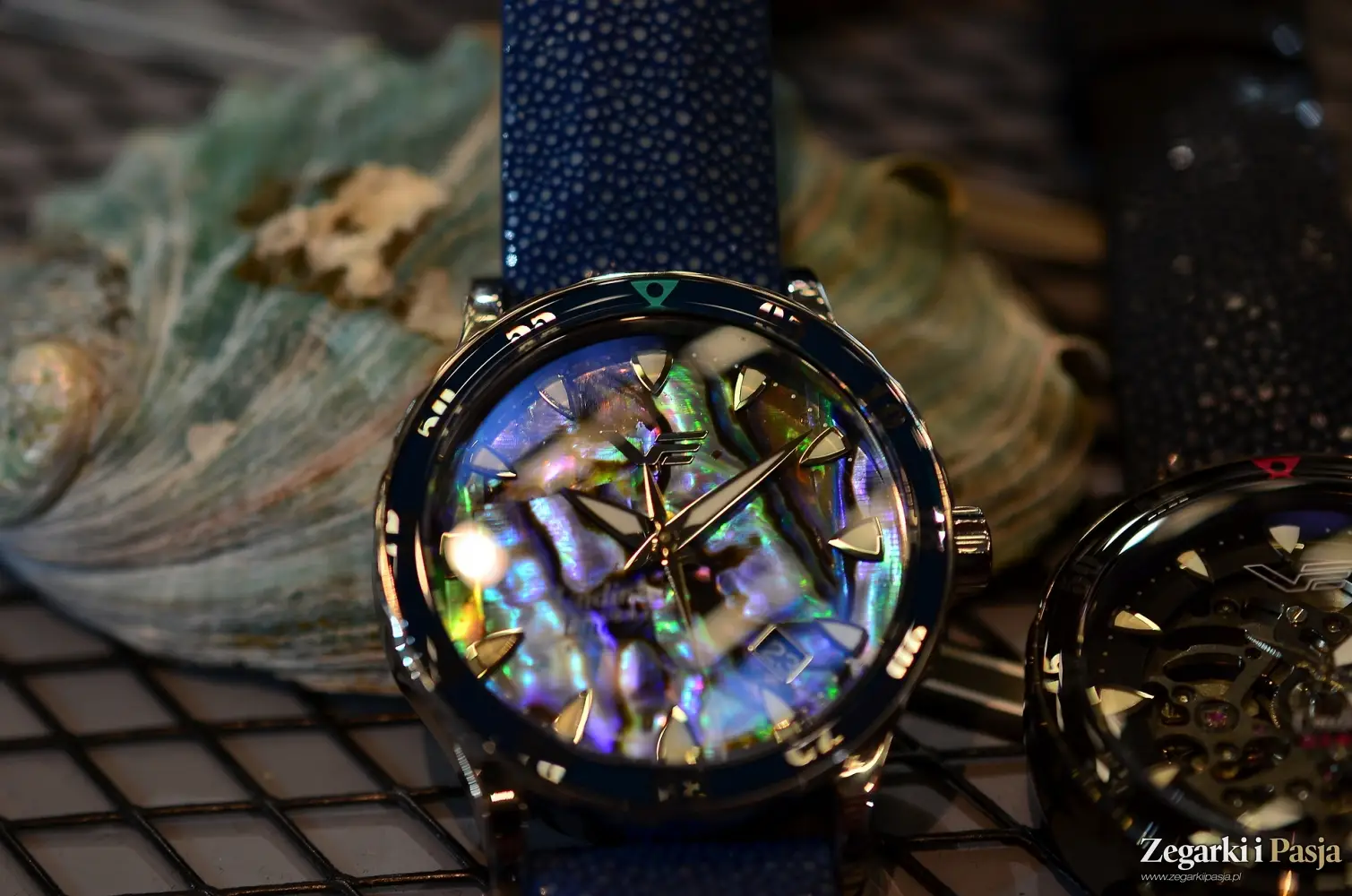 Każda tarcza jest jedyna w swoim rodzaju, z unikalnym wzorem utworzonym przez organiczną strukturę muszli, dzięki czemu każdy zegarek jest naprawdę indywidualny i niepowtarzalny. Wzory jakie widzimy są bardzo wyraziste, bardzo ciekawe i bardzo różnorodnie odbijają światło. Zależnie od tego, pod jakim kątem na tę tarczę patrzymy, wygląda wręcz fenomenalnie i trudno ją opisać, a jeszcze trudniej było… zrobić fajne zdjęcie.