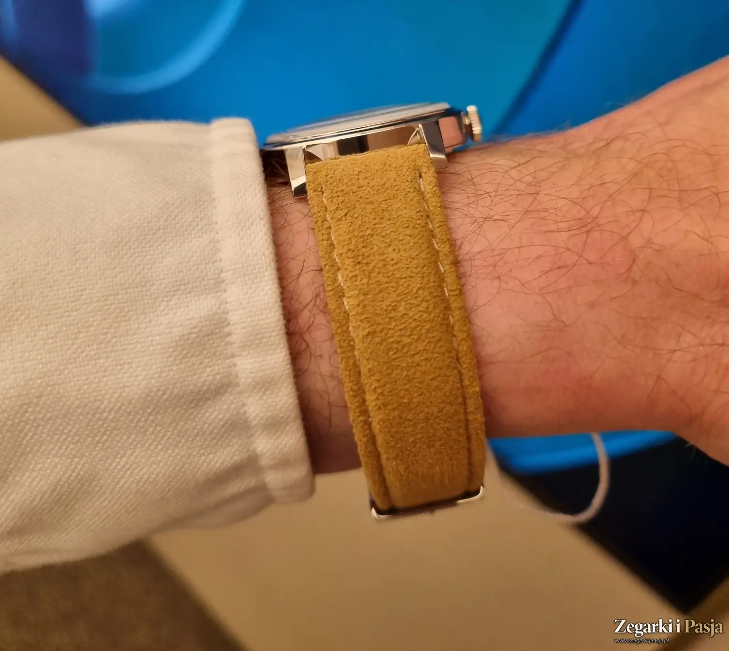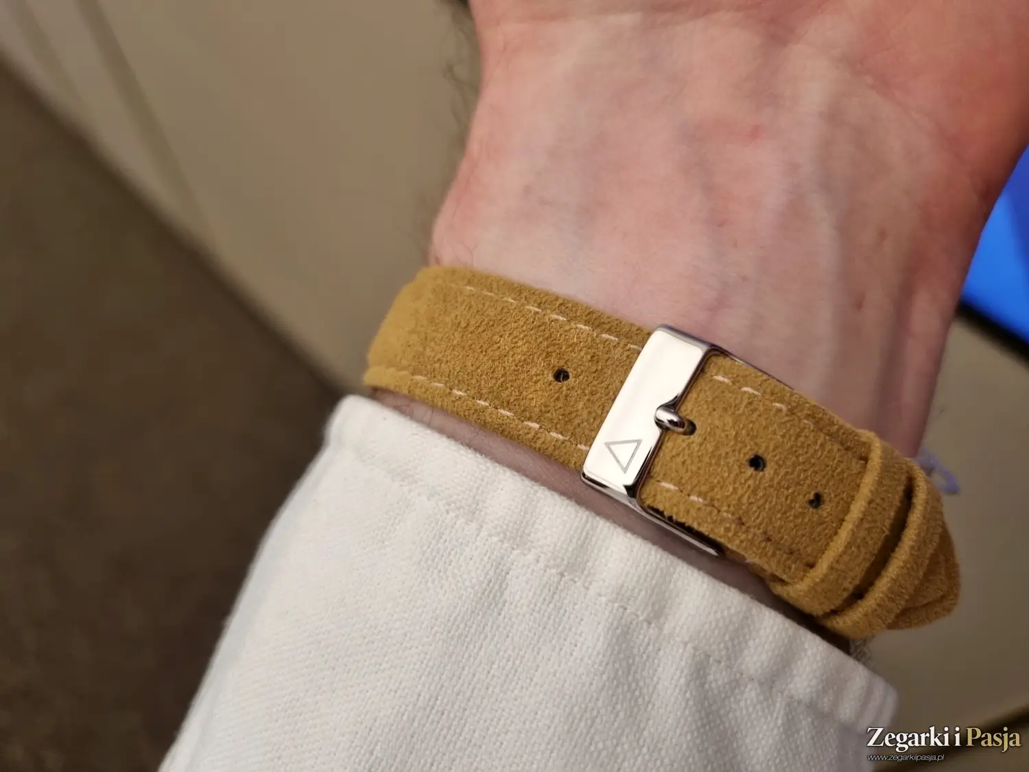 Następnie zapinamy na nadgarstku miękki pasek wykonany z Alcantary - materiału, który pod palcami przypomina zamsz, ale jest od niego trwalszy i bardziej odporny na trudy i niekorzystne warunki codziennego użytkowania. To subtelny detal, ale dokładnie taki, jak cały ten zegarek.