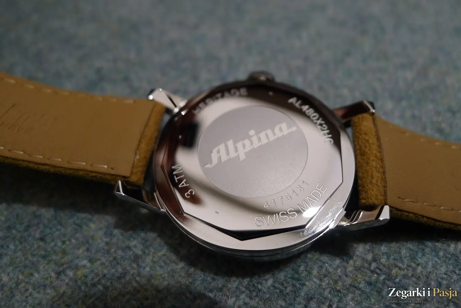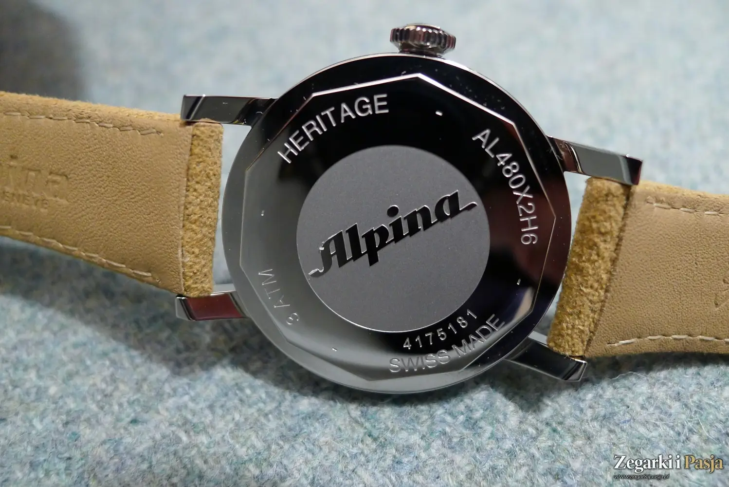 Obracając zegarek na drugą stronę naszym oczom ukazuje się stalowy, pełny dekiel, z naniesionym logo marki Alpina i napisami: „Heritage”, „Swiss made”, oznaczeniem klasy wodoszczelności na poziomie 3 ATM oraz numerem referencyjnym. W przypadku wersji z białą tarczą jest to oznaczenie AL-480S2H6, natomiast z czarną tarczą numer ten, to AL-480B2H6.