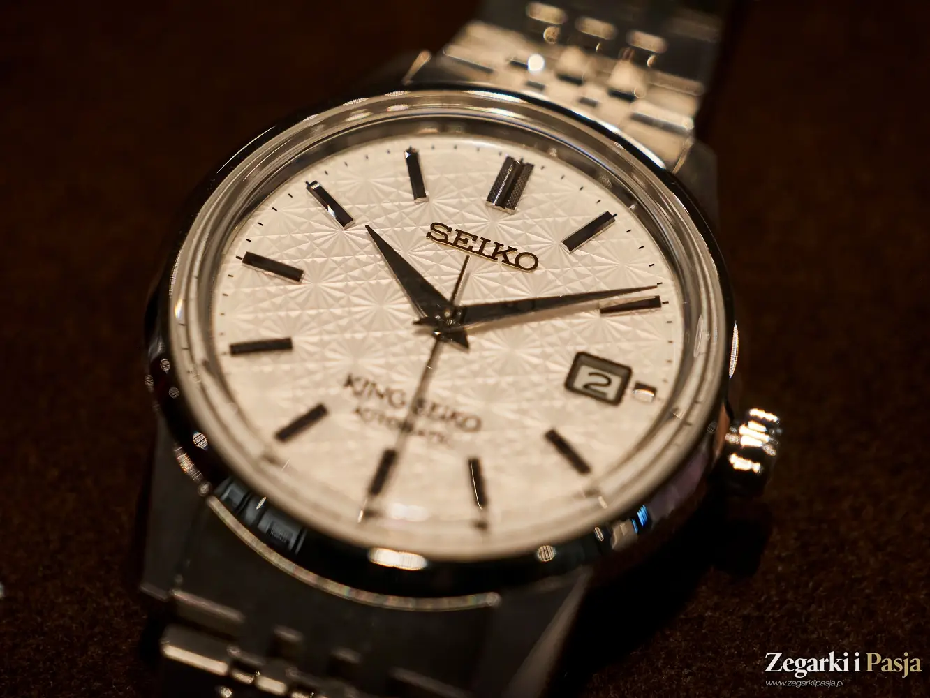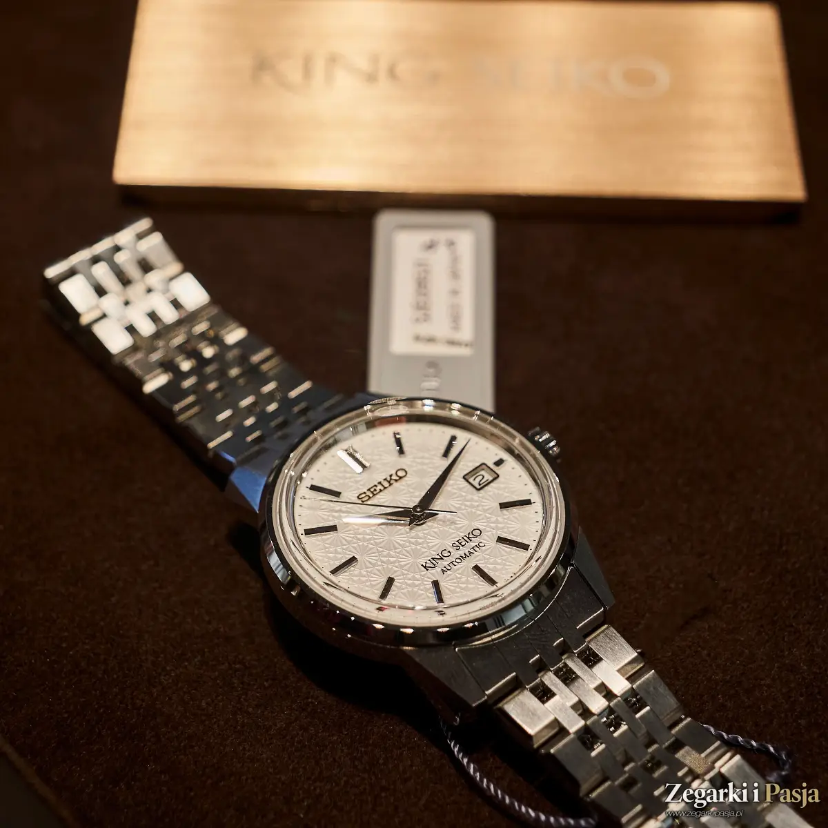 Jasna tarcza o wzorze tłoczonej rozety, wygląda jak z Grand Seiko - jest biała, choć refleksy światła sprawiają, że wydaje się lekko kremowa, perfekcyjnie czytelna, z nakładanymi, prostymi indeksami oraz złotym, nałożonym napisem SEIKO pod godziną 12. i czarnym oznaczeniem KING SEIKO AUTOMATIC nad 6. Okienko daty ze srebrnym obramowaniem jest tradycyjnie na pozycji godziny 3., podobnie jak bardzo wygodna koronka. Od spodu mamy pełny, stalowy, wkręcany dekiel ozdobiony logo King Seiko, to tez ukłon w stronę tradycji – w latach 60. i 70. XX wieku przeszklone dekle nie był „w trendzie”, ponieważ mechanizmy zwykle nie były dekorowane, tam liczyła się bardziej funkcja niż forma. Wodoszczelność tego klasycznego modelu też jest jak najbardziej klasyczna – 50 metrów.