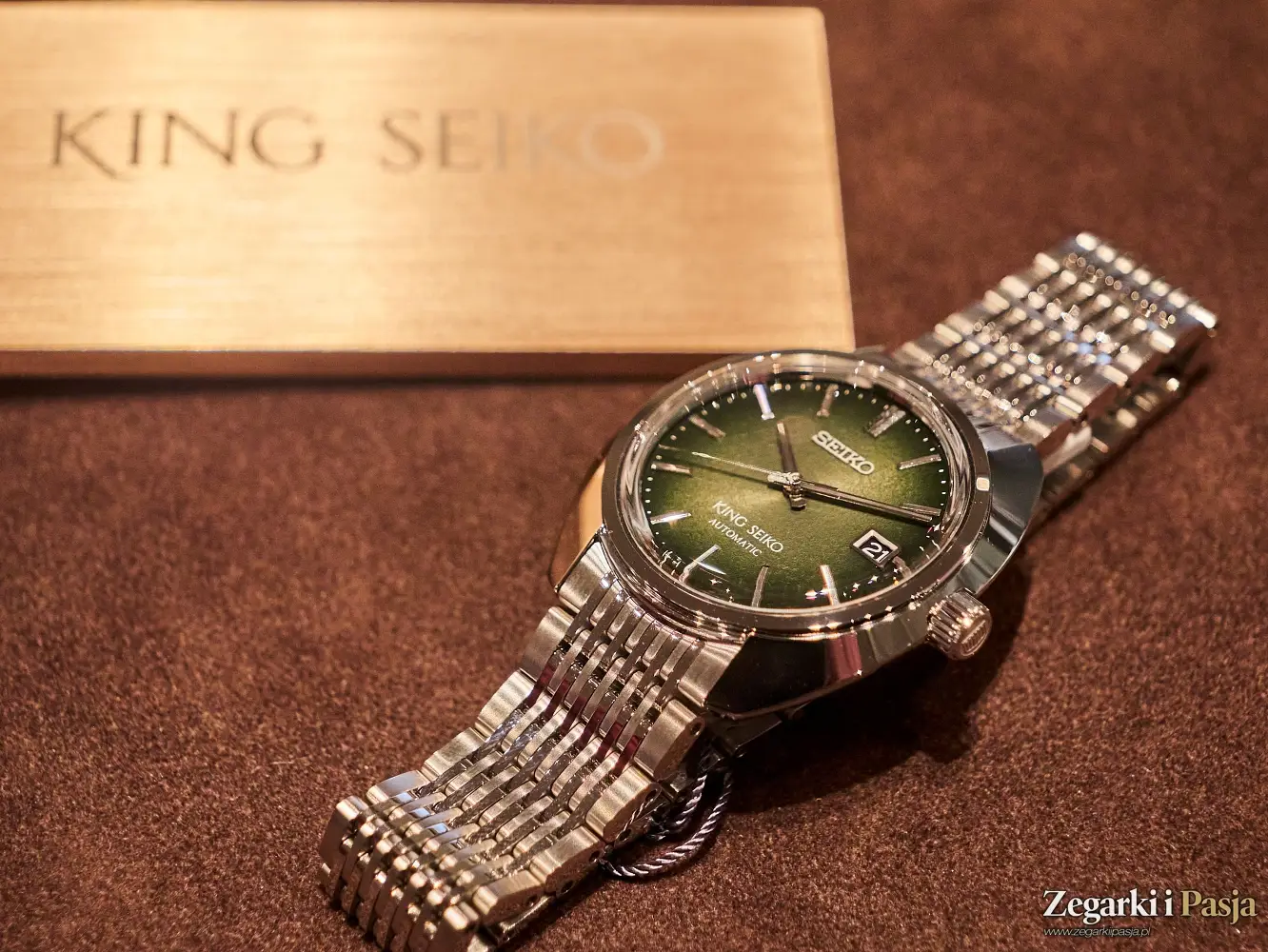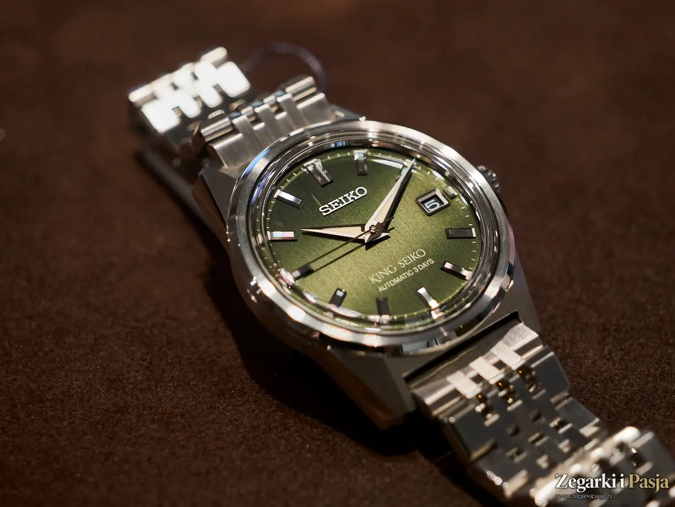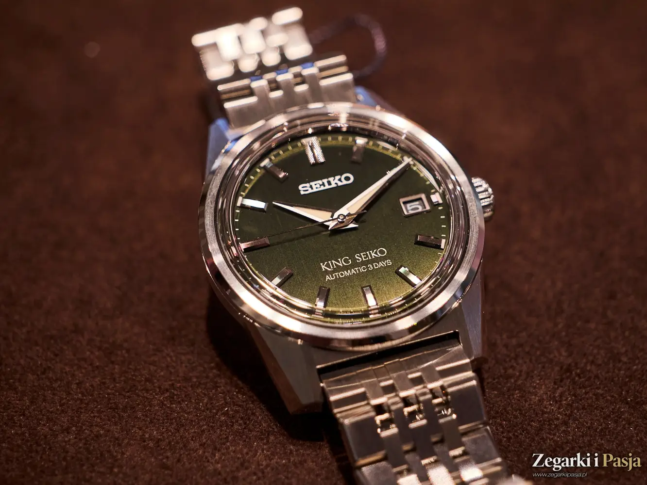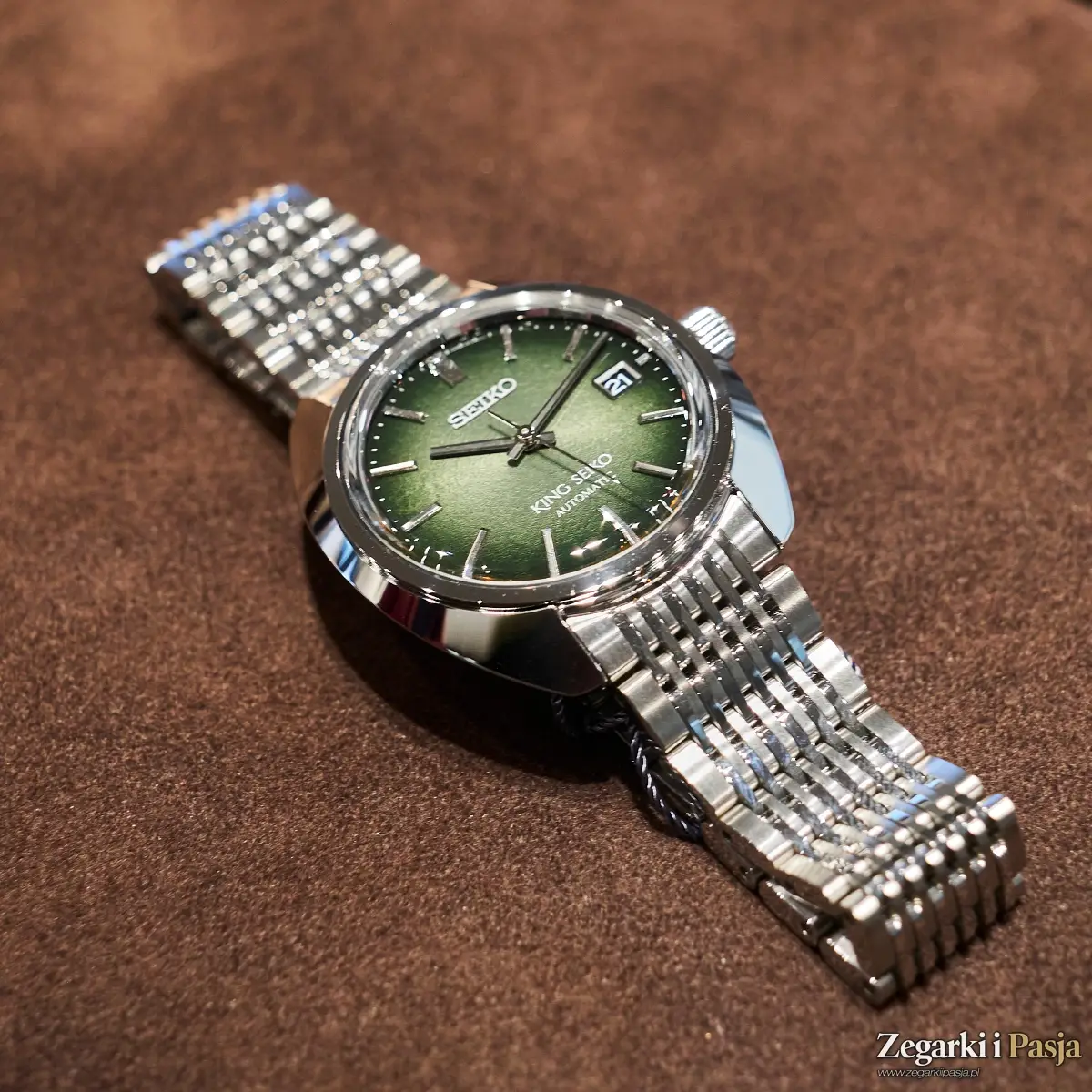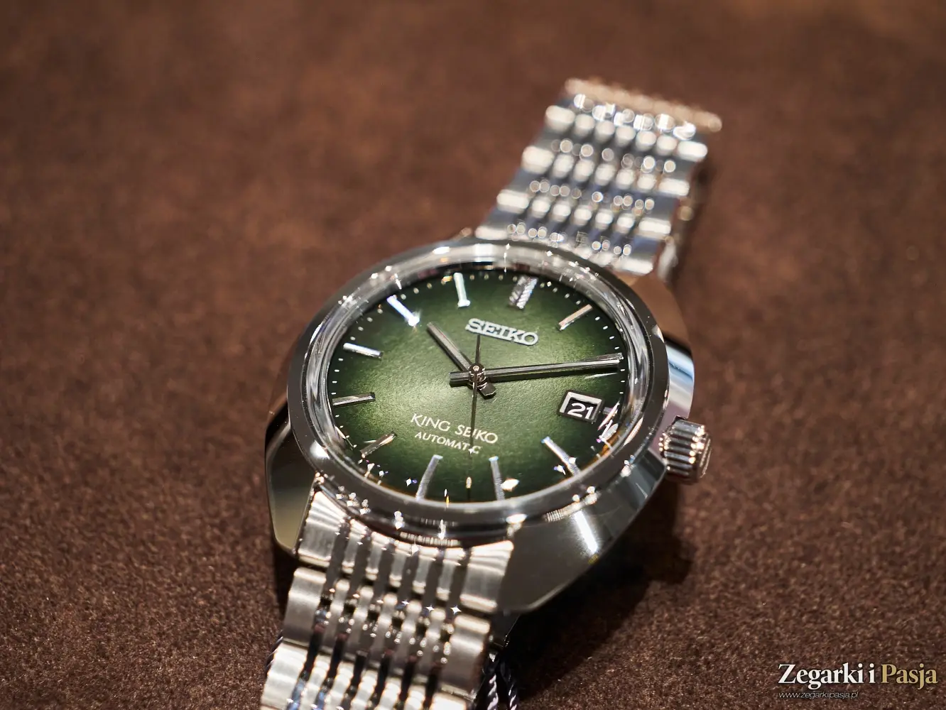 Ostatni z modeli King Seiko, z którym miałem przyjemność poznać się w podczas wizyty w salonie Seiko Watch Salon w Warszawie, to ‘Forest Green’ 6L 1969 Re-Interpretation, czyli bliźniaczy model opisywanego przed momentem zegarka, ale z tarczą o wzorze ciemnozielonego, leśnego mchu, matową i chropowatą, w przeciwieństwie do połyskującego purpurą cyferblatu poprzednika. Wszystkie pozostałe cechy tego modelu, oznaczonego referencją SJE113J1 są identyczne.