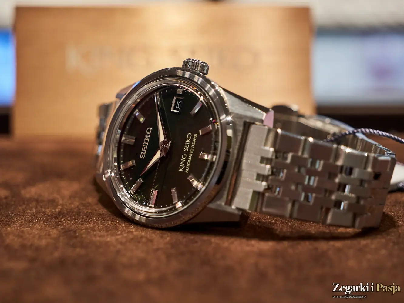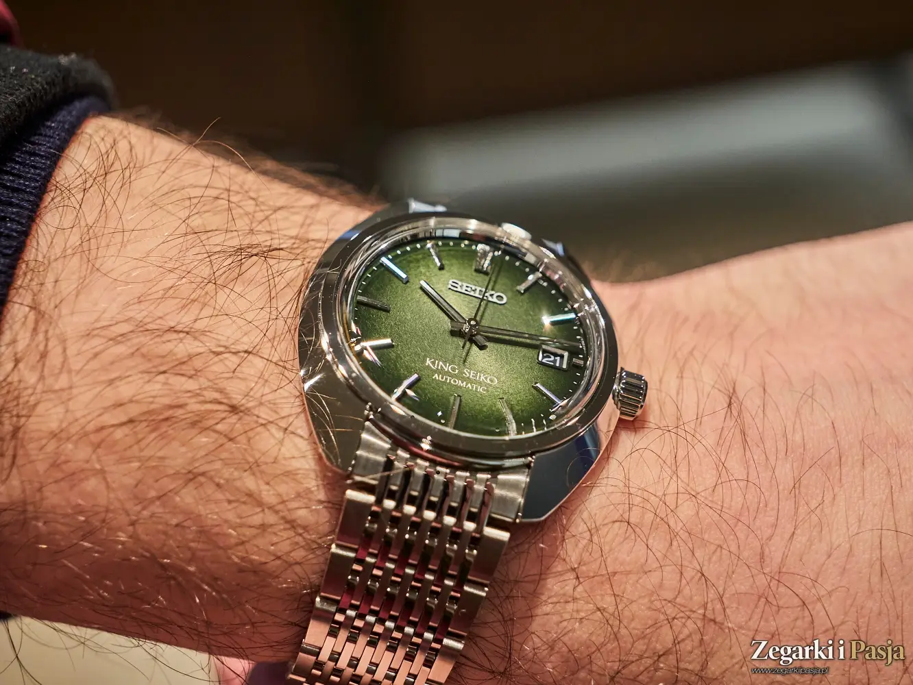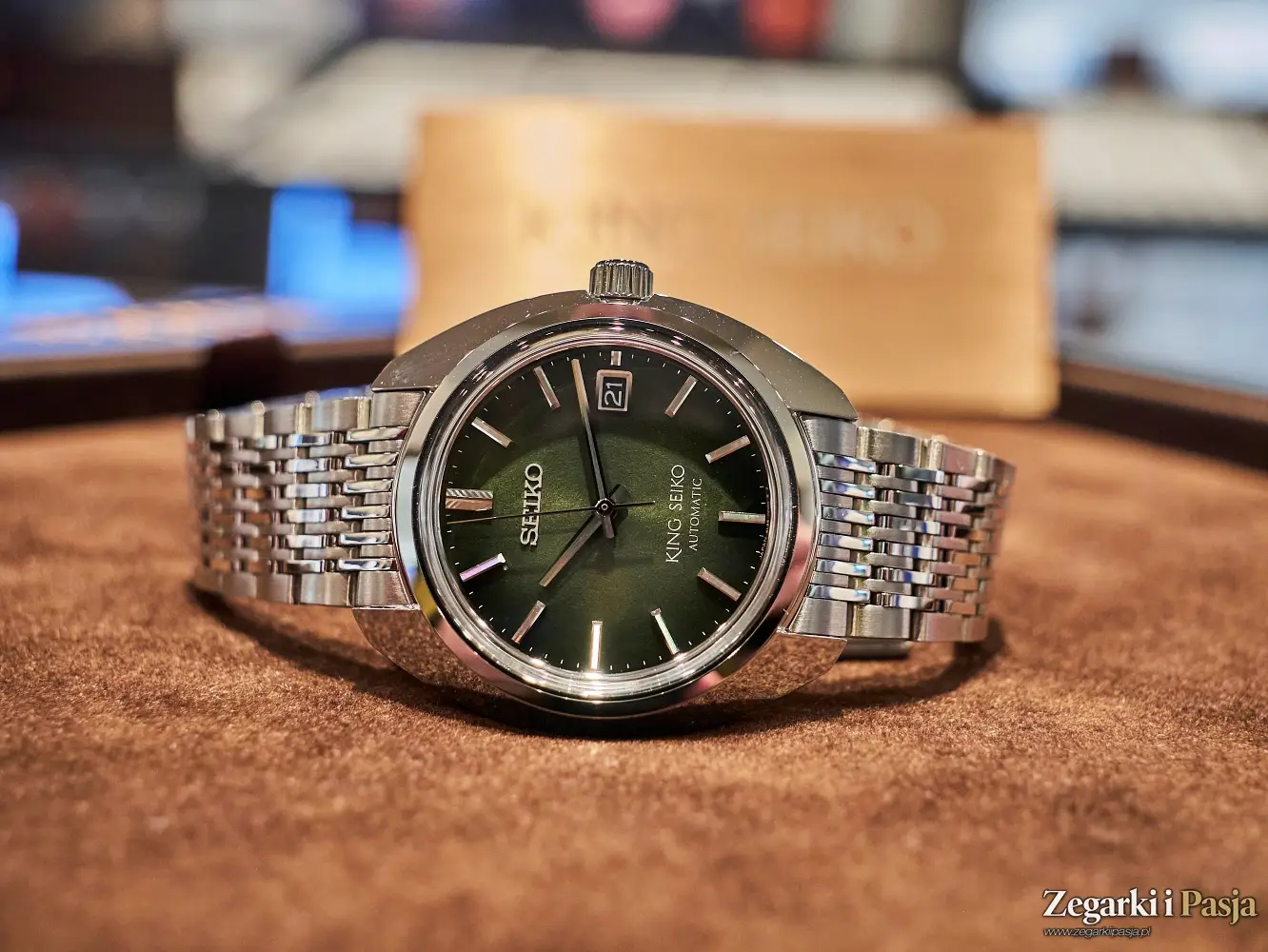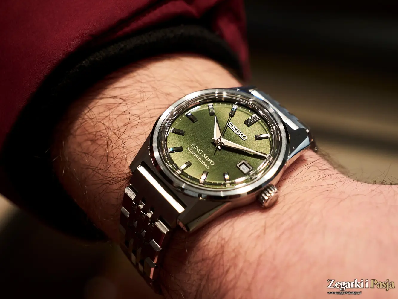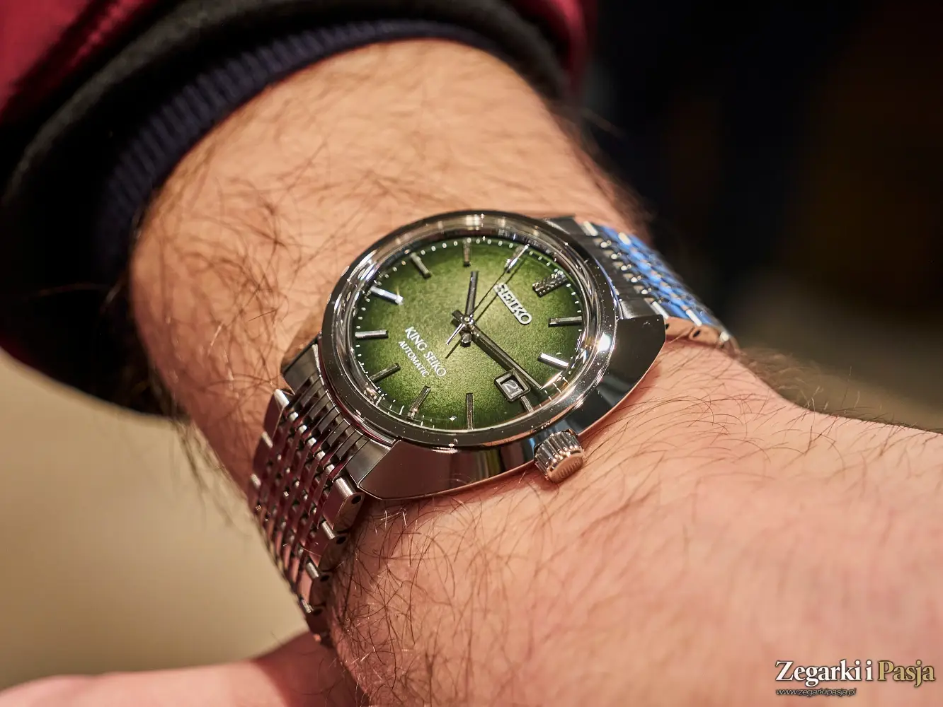 Ostatni z modeli King Seiko, z którym miałem przyjemność poznać się w podczas wizyty w salonie Seiko Watch Salon w Warszawie, to ‘Forest Green’ 6L 1969 Re-Interpretation, czyli bliźniaczy model opisywanego przed momentem zegarka, ale z tarczą o wzorze ciemnozielonego, leśnego mchu, matową i chropowatą, w przeciwieństwie do połyskującego purpurą cyferblatu poprzednika. Wszystkie pozostałe cechy tego modelu, oznaczonego referencją SJE113J1 są identyczne.