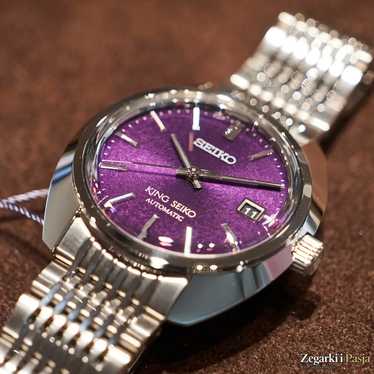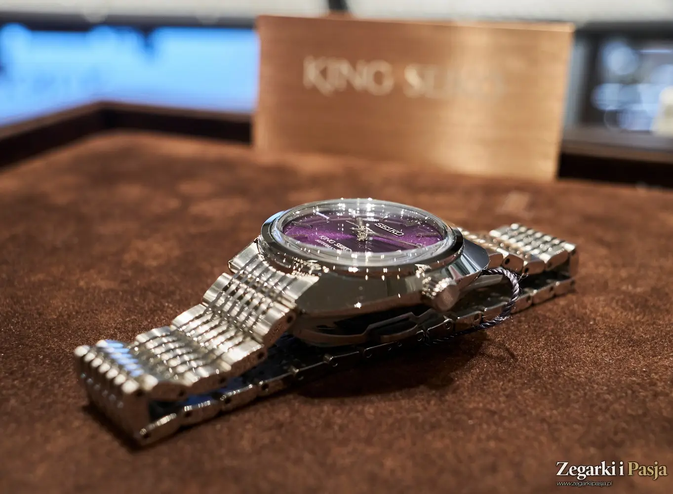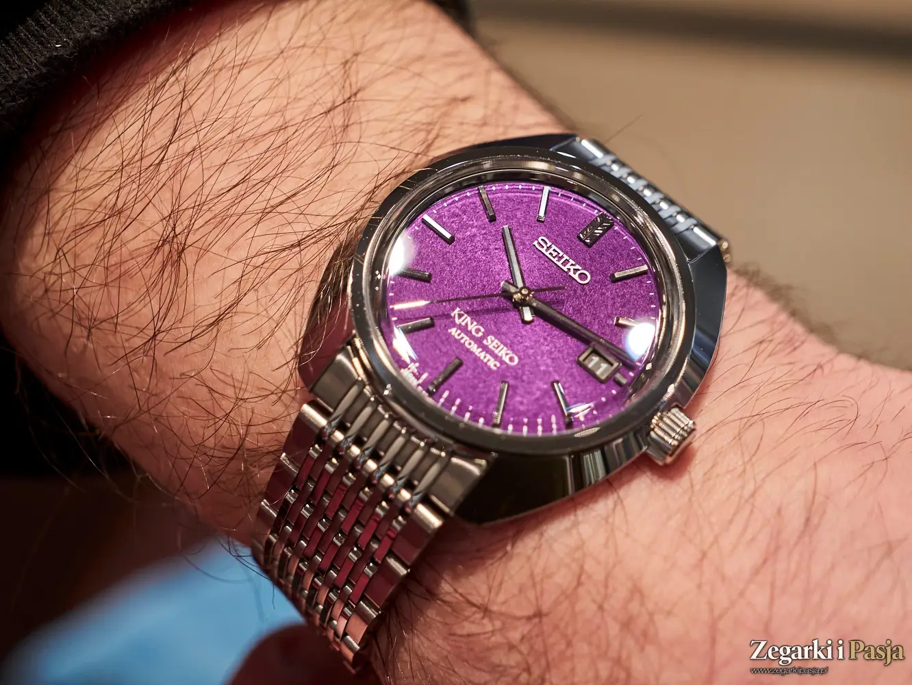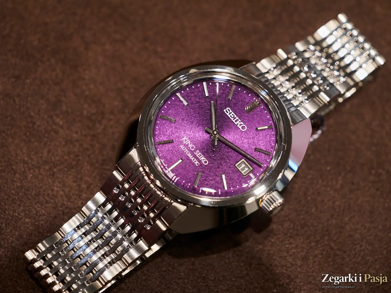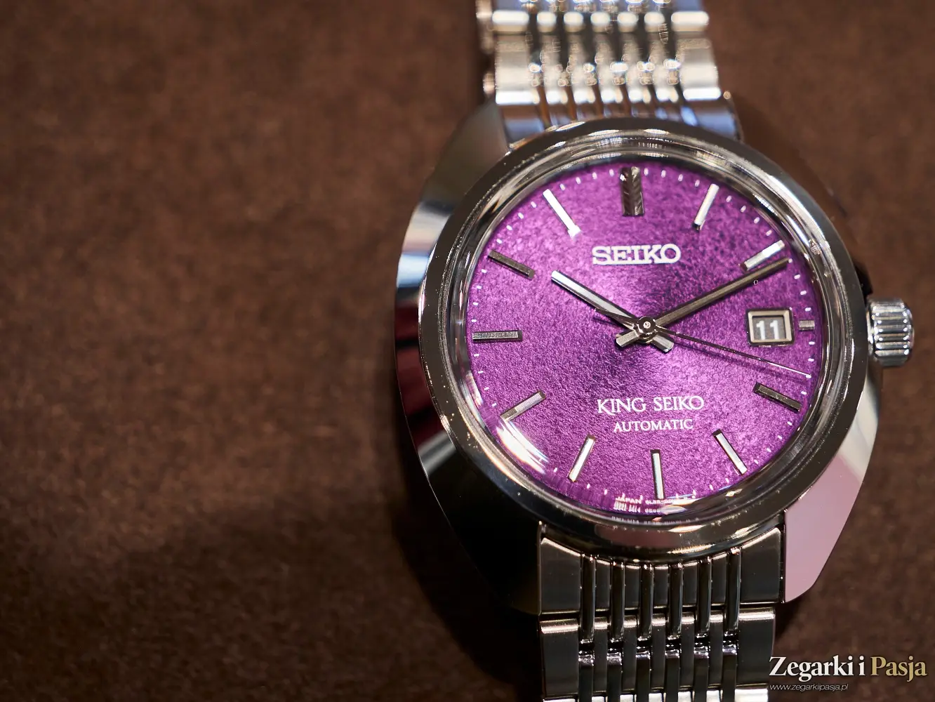 Kolejny ciekawy zegarek mechaniczny z nowej kolekcji King Seiko, jaki spotykam w salonie, to ‘Edo Purple’ 6L 1969 Re-Interpretation, współczesna wersja modelu z roku 1969, z niezwykłym kolorem tarczy – intensywną purpurą, która nadaje mu prawdziwego retro-blasku.