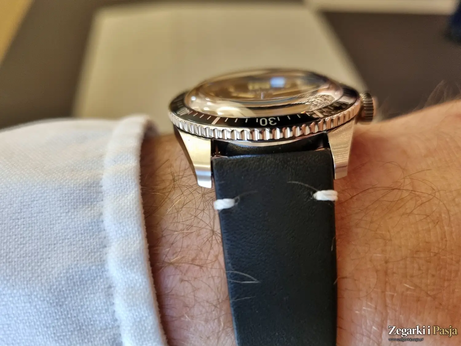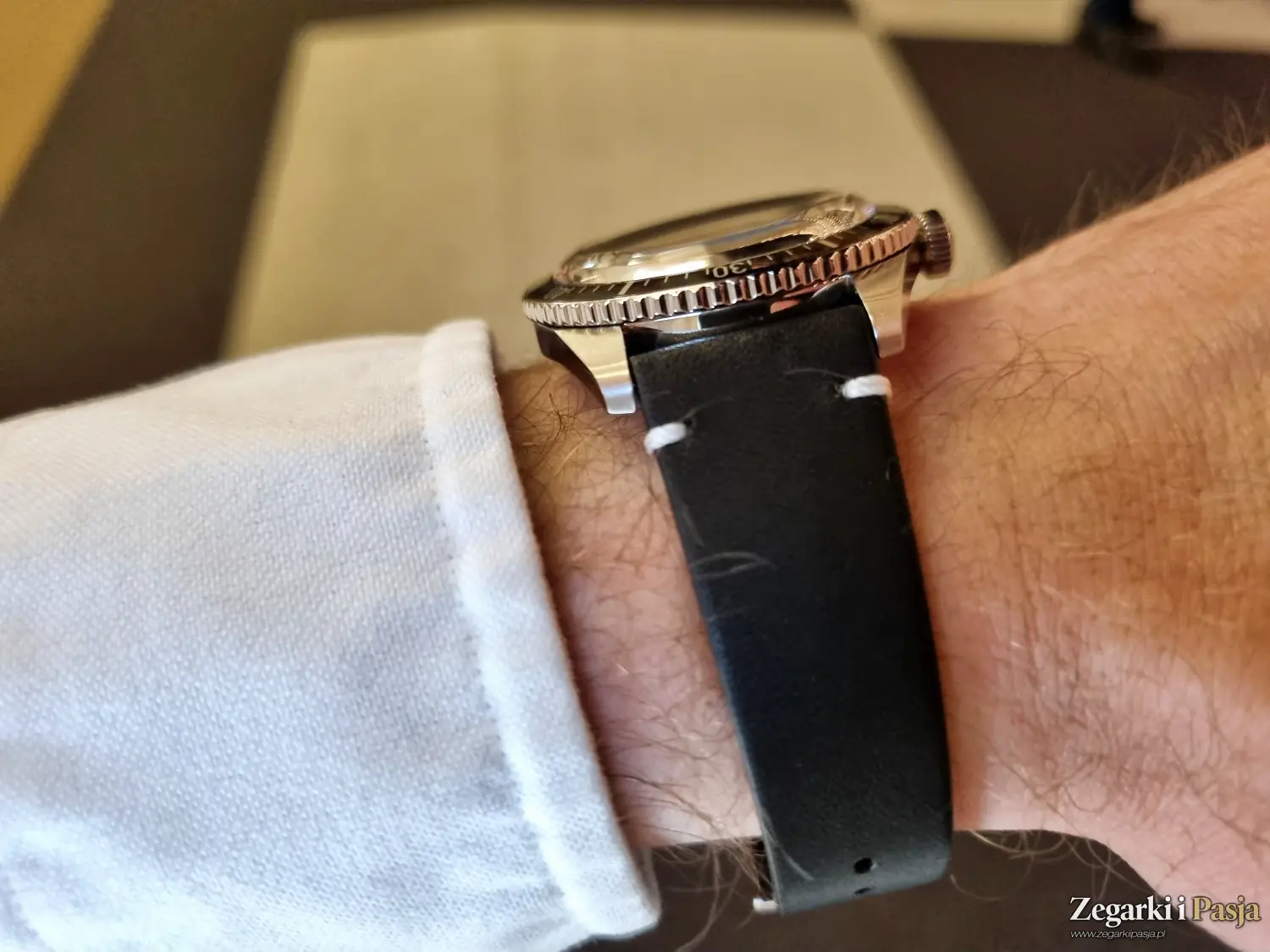 Przy wspomnianej średnicy 40 mm stalowa koperta ma wysokość od ucha do ucha na poziomie 48 mm, a jej grubość to jedynie 12, 8 mm. Te wymiary wyraźnie pokazują, że zegarek ten może być doskonałym modelem do użytku na co dzień, w zasadzie do założenia przy prawie każdej okazji, ponieważ - mimo, iż jest to sportowy, nurkowy zegarek - ma naprawdę bardzo duży poziom elegancji, jak na tego typu modele. Szczególnie, gdy nosimy go na pasku.