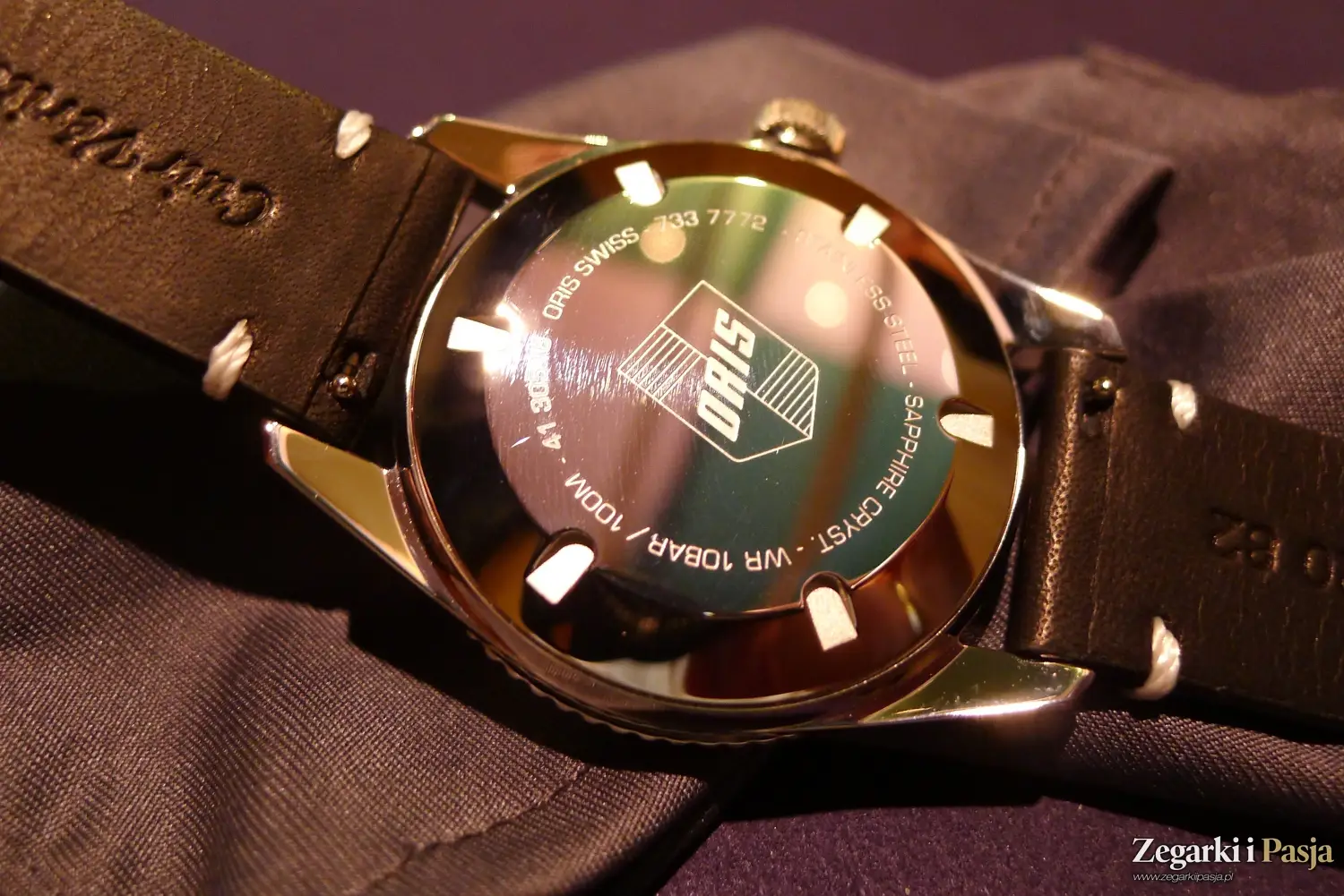 Na wypukłej tarczy w kolorze czarnym, są to krótsze indeksy, a także pojedyncze, duże luminescencyjne cyfry na godzinach 3., 6., 9. i 12., o stylistyce zaczerpniętej bezpośrednio z oryginału z 1965 roku. A także, co najważniejsze, retro logo Oris ze słowem „wodoodporny” pod spodem, przywrócone po raz pierwszy we współczesnej historii tej marki.