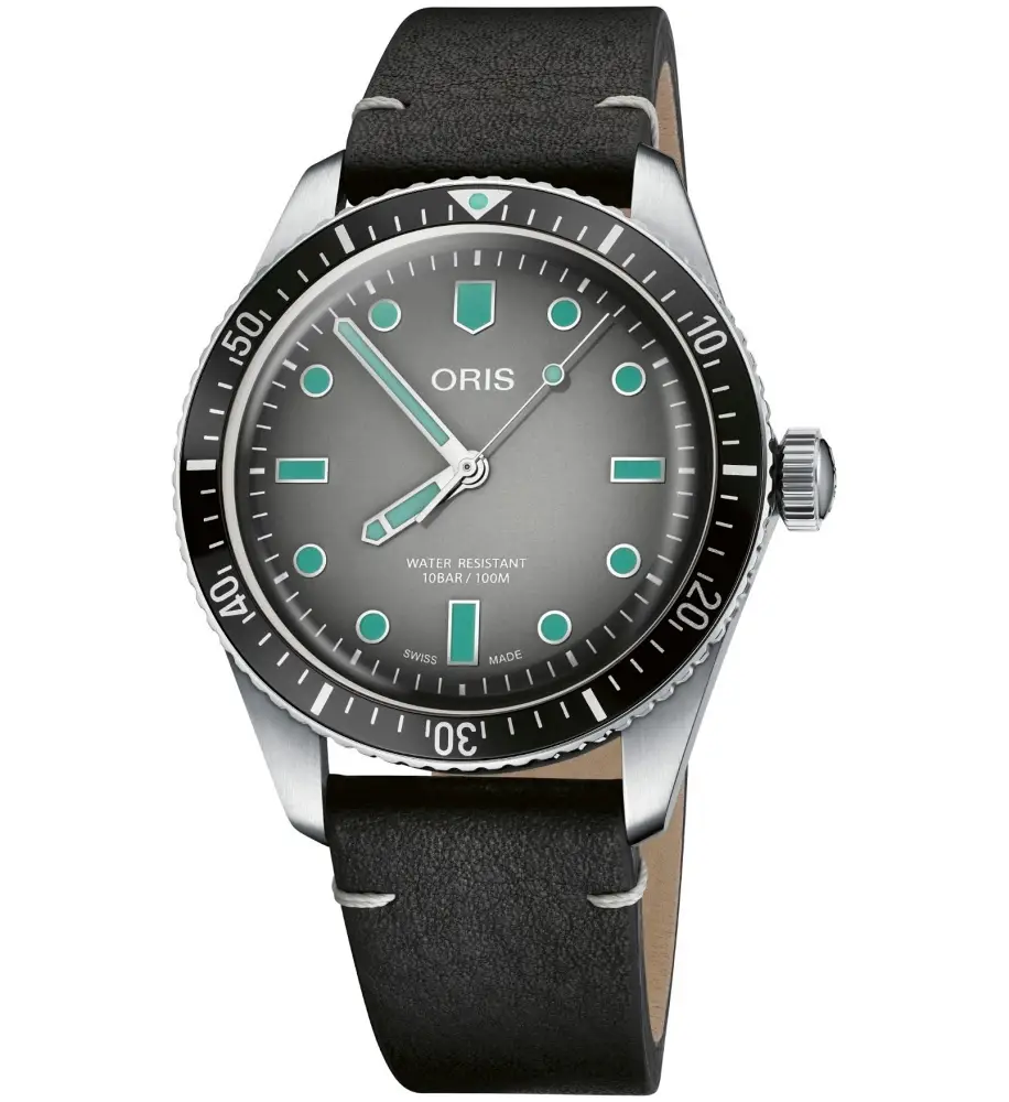 Oris Divers Sixty Five (ref. 01 733 7707 4053-07 5 20 89) to bezpośrednie nawiązanie do pierwszego „nurka” od marki ORIS stworzonego w 1965 roku. Cechuje się on gradientową tarczą w odcieniu szarości i turkusową barwą substancji luminescencyjnej umieszczonej na indeksach godzinowych i wskazówkach, które pozwalają na precyzyjny odczyt czasu nawet w najtrudniejszych warunkach, oraz charakterystycznego dla marki ORIS indeksu godziny 12., stylizowanego na herb w kształcie tarczy.