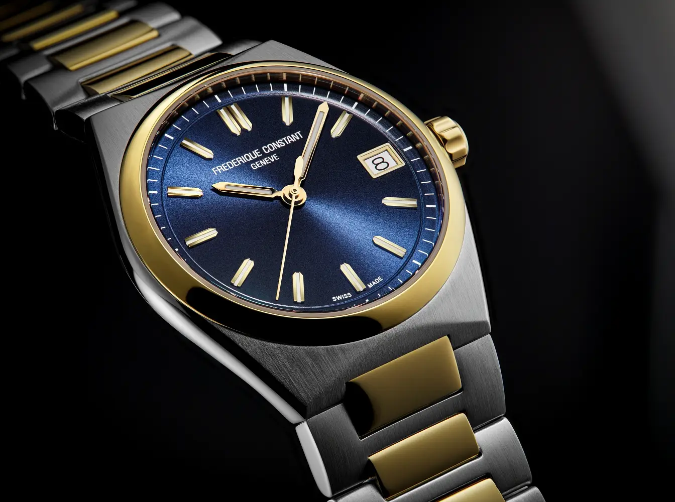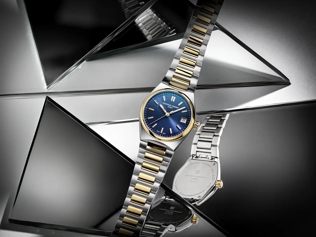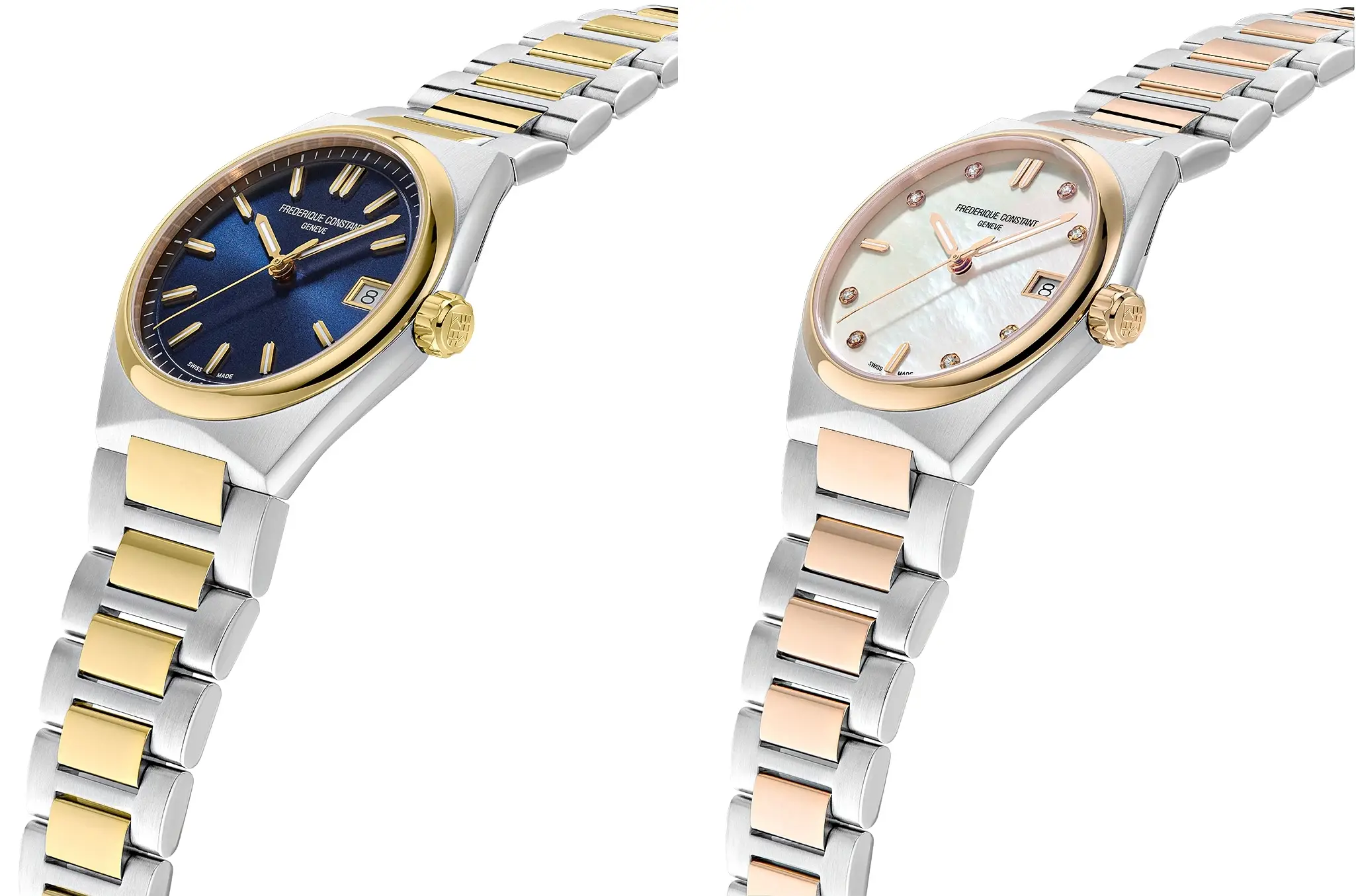 Frederique Constant Highlife Ladies Quartz w wersji z tarczą granatową występuje w opcji tzw. bi-color. Mamy w tym przypadku koronkę, lunetę oraz środkowy rząd ogniw bransolety w kolorze żółtego złota. Druga wersja z tarczą granatową ma elementy koperty i bransolety w naturalnym kolorze stali, ale za to nakładane indeksy, poza tymi na godzinach 6., 9. i 12., zastąpiono diamentami. Na godzinie 3. w żadnej z wersji nie ma klasycznego indeksu, ponieważ tam wycięto okienko datownika otoczone ramką.