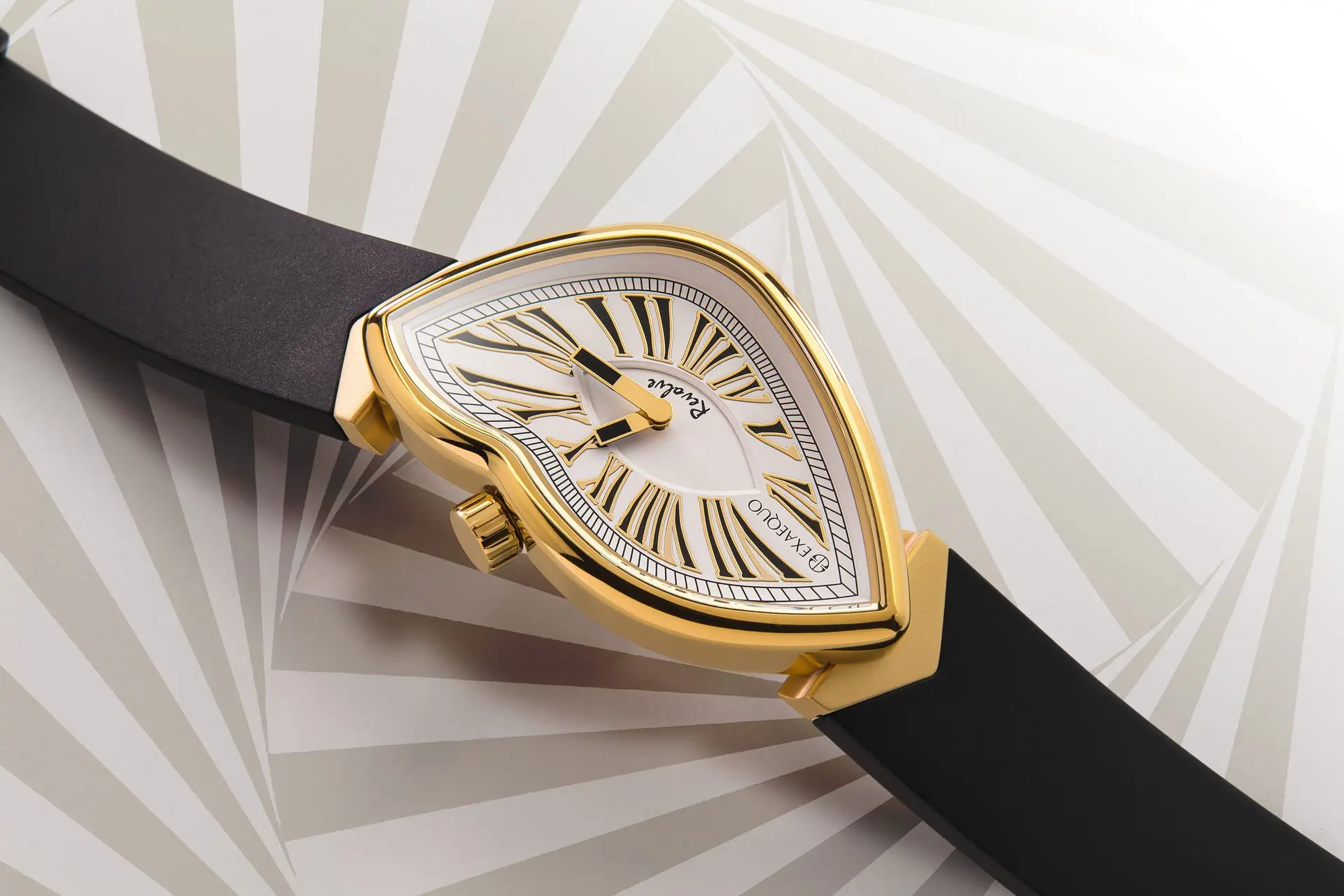 Revolve Melting Watch PVDYG SS316L to model, który wprowadza nową estetykę do kolekcji Exaequo. Jego koperta, również wykonana ze stali nierdzewnej 316L z powłoką PVD w kolorze żółtego złota, ma większe wymiary (51,2 mm x 33 mm) i bardziej zdecydowany, asymetryczny kształt. Linie koperty są ostre, z wyraźnymi kątami, które w połączeniu z krzywiznami tworzą efekt przypominający surrealistyczne usta - to odważne nawiązanie do ruchu surrealistycznego. Polerowana powierzchnia koperty podkreśla jej nowoczesny charakter, koronka została umieszczona po lewej stronie.